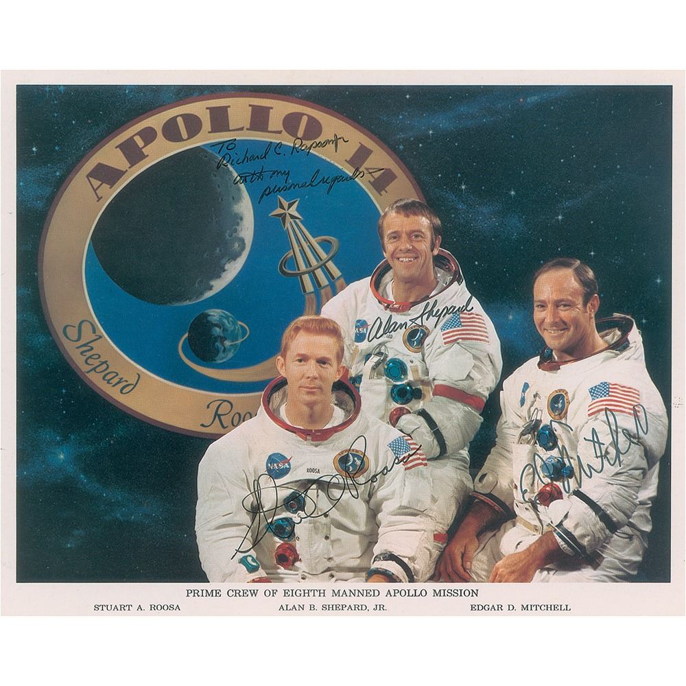 Official color 10 x 8 NASA lithograph of the Apollo 14 crew posing in their white space suits against a background bearing their mission insignia, signed and inscribed in black felt tip, "To Richard C. Rapson, Jr., with my personal regards—Alan Shepard," "Ed Mitchell," and "Stu O. Roosa.” In fine condition, with a faint bend to the upper right background area and a light pencil notation to reverse.
