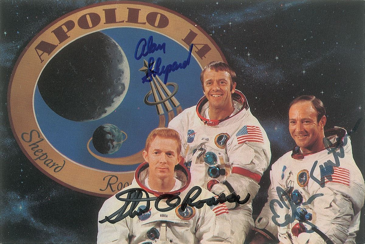 Uncommon color 6 x 4 postcard photo of the Apollo 14 prime crew, signed in blue felt tip by Alan Shepard and in black felt tip by Edgar Mitchell and Stu Roosa. In fine condition.
