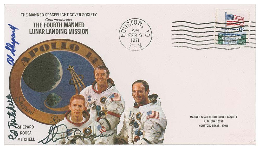 Commemorative cover with a cachet of the Manned Spaceflight Cover Society honoring the Apollo 14 mission, signed in blue and black felt tip by Alan Shepard, Edgar Mitchell, and Stu Roosa. In fine condition.