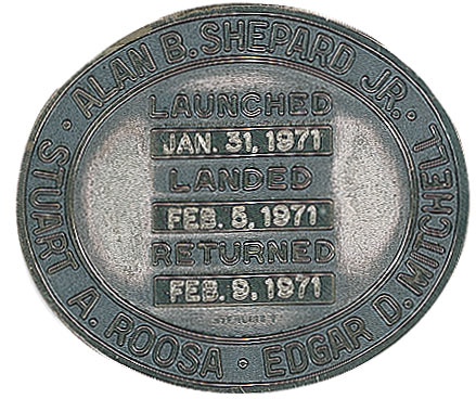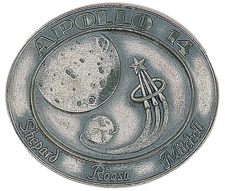Flight-flown Apollo 14 Robbins Medal, approximately 1.5 diameter, with a raised design on the face of the Apollo 14 mission insignia. The reverse of the sterling silver medal is engraved with the full names of astronauts Alan B. Shepard, Stuart A. Roosa, and Edgar D. Mitchell, along with the January 31, 1971, launch date, February 5, 1971, moon landing date, and February 9, 1971 return date. This medal is serial numbered “263” along the rim. Normal condition. This item originated from the collection of Buzz Aldrin and was first sold in 1990 by Superior Galleries.