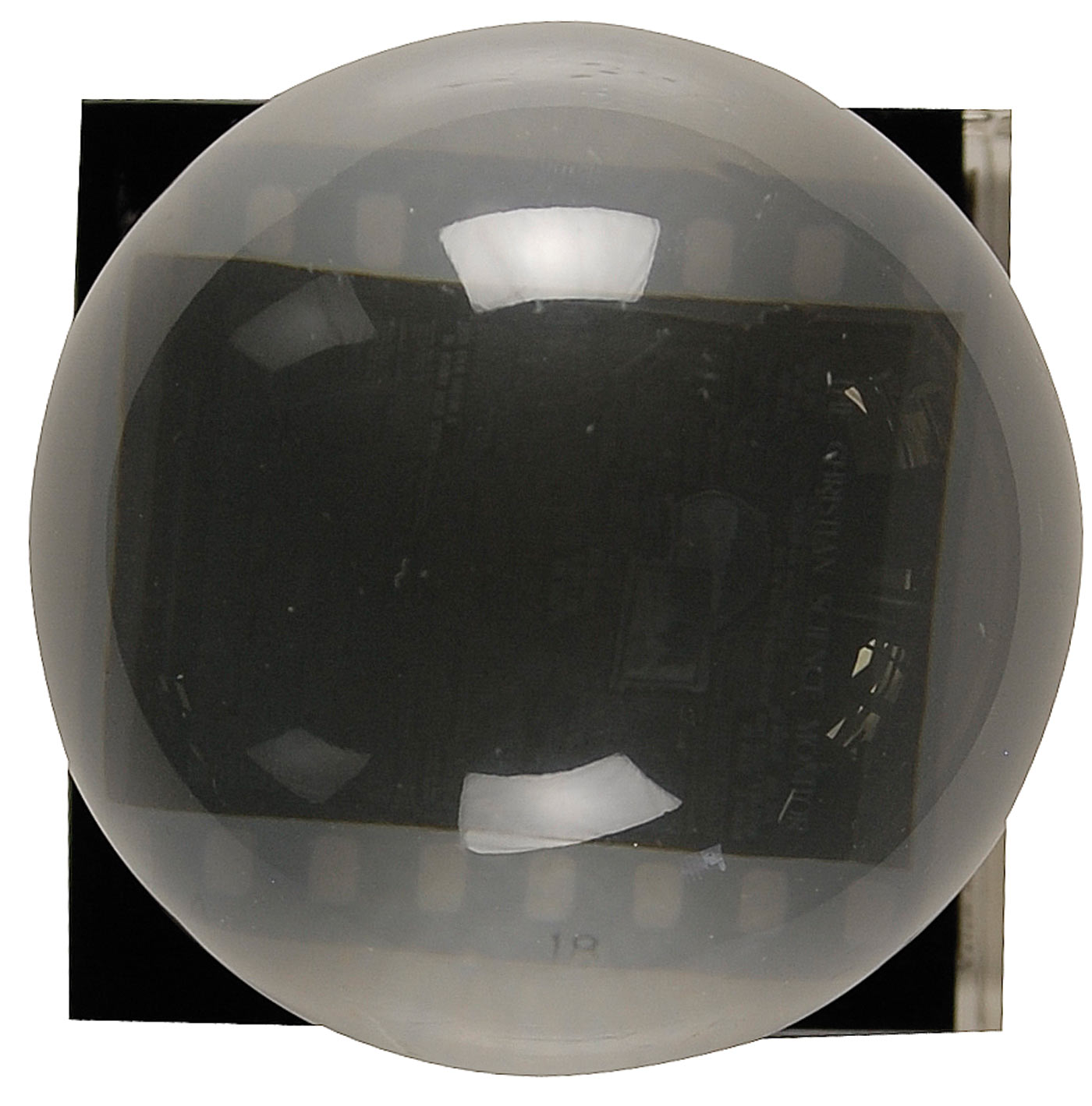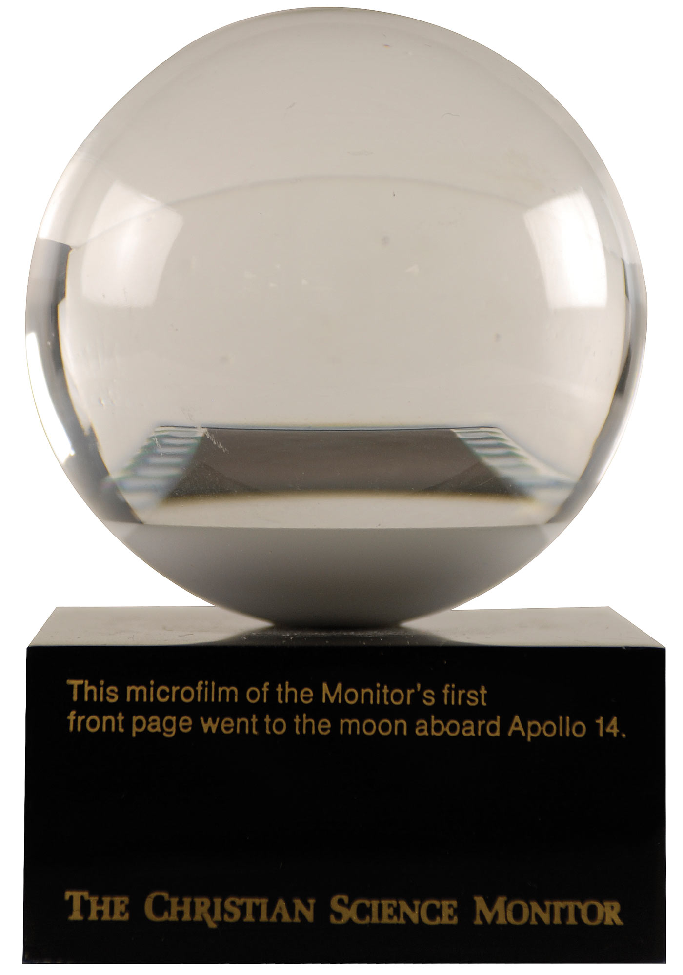 Small piece of flight-flown microfilm picturing the front page of the Christian Science Monitor newspaper that traveled aboard Apollo 14 on its lunar voyage. The film is encased within a small globe set upon a black base, total height 4-inches. A small label on the bottom of the base reads in full: “This microfilm of the front page of The Christian Science Monitor’s first edition dated November 25, 1908, was taken to the moon on February 5, 1971, aboard Apollo 14. This is one of 100 carried by Captain Alan B. Shepard, commander of the mission.”