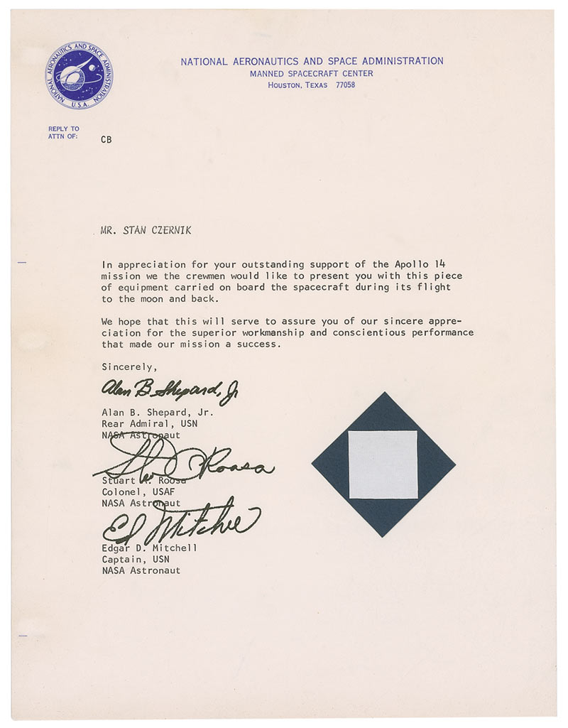 Flight-flown fabric swatch, 1 x 1, flown aboard the Apollo 14 mission, affixed to a letter of presentation, bearing printed signatures of the Apollo 14 crew, 8 x 10.5, NASA letterhead. Presented to Stan Czernik, letter reads, in part: “In appreciation for your outstanding support of the Apollo 14 mission we the crewmen would like to present you with this piece of equipment carried on board the spacecraft during its flight to the moon and back.”