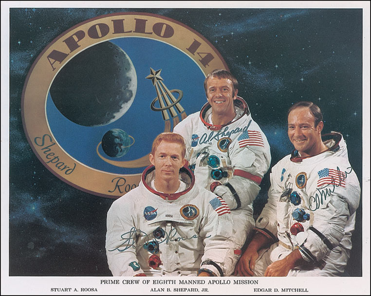 Color 10 x 8 NASA photo of the Apollo 14 crew posing in their spacesuits in front of their mission insignia, signed in black felt tip by Alan Shepard, Ed Mitchell, and Stu Roosa. In fine condition, with a bit of light contrast to portions of Roosa’s signature.