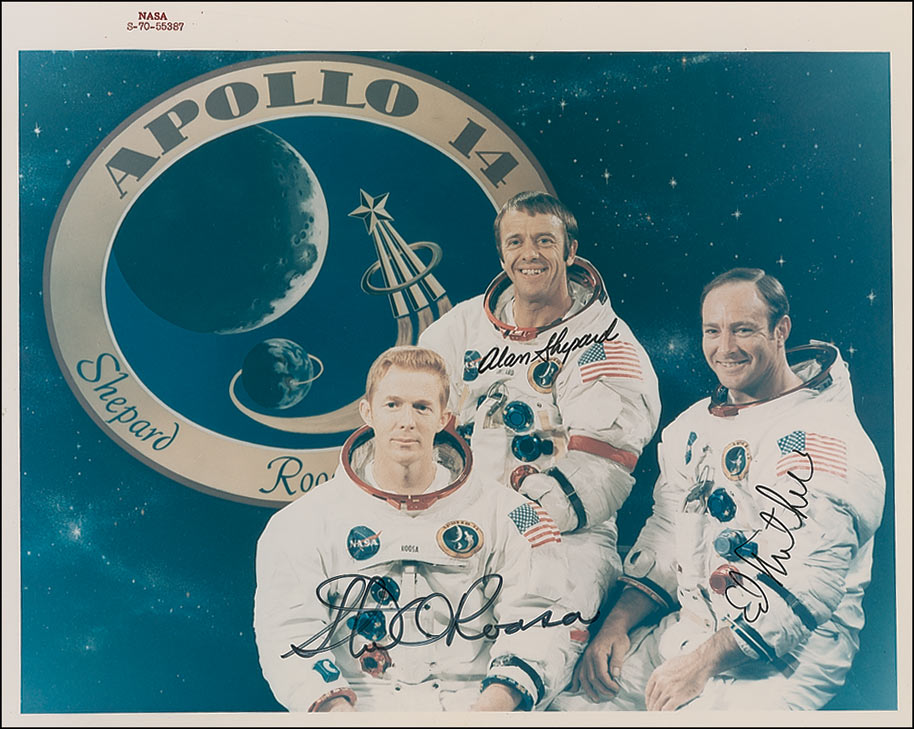 Color 10 x 8 semi-glossy ‘red-numbered’ NASA photo of the Apollo 14 prime crew posing in their spacesuits in front of their mission insignia, signed in black felt tip by Alan Shepard, Ed Mitchell, and Stu Roosa. In fine condition.