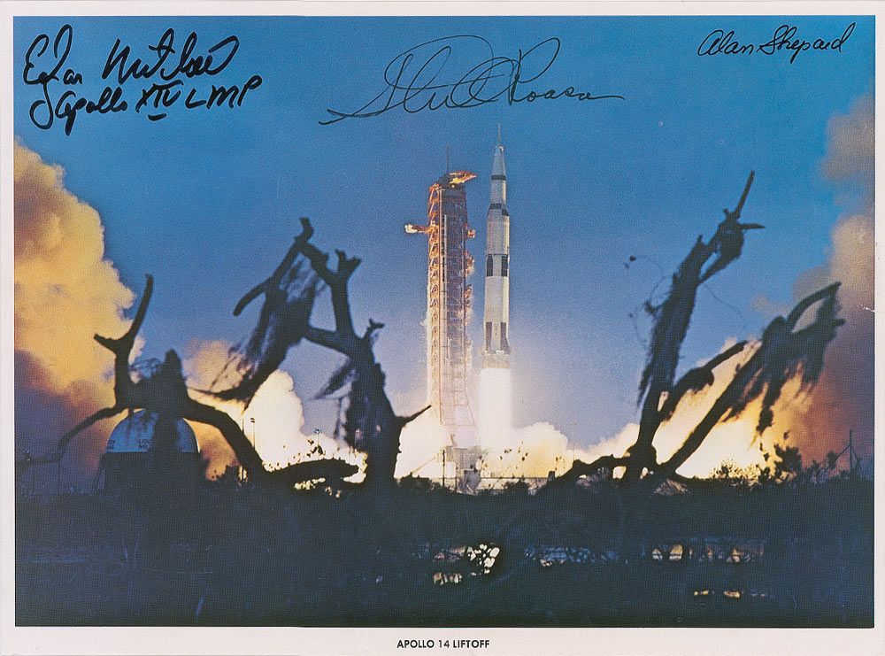 Color 10.75 x 8 cardstock photo of the liftoff of Apollo 14, signed in black felt tip, “Alan Shepard,” “Stu Roosa,” and “Edgar Mitchell Apollo XIV LMP.” In fine condition.