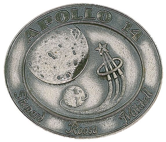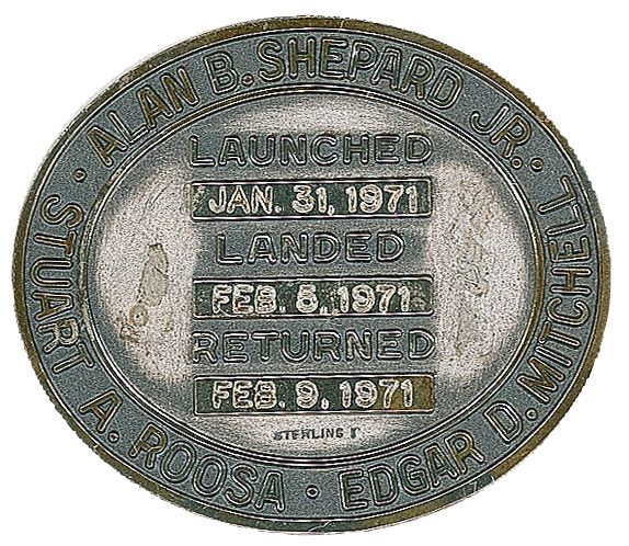 Flown Apollo 14 Robbins medal, approximately 1.5 diameter, with a raised design on the face of the Apollo 14 mission insignia. The reverse of the sterling silver medal is engraved with the full names of astronauts Alan B. Shepard, Stuart A. Roosa, and Edgar D. Mitchell, along with the January 31, 1971, launch date, February 5, 1971, moon landing date, and February 9, 1971, return date. This medal is serial numbered “220” along the rim. In normal condition, with a bit of light tarnishing around the rim. Accompanied by a 1996 letter of authenticity signed by Alan Shepard, which states: “This is to verify that the accompanying silver medal, the insignia of the flight of Apollo 14, was flown to the moon on board the spacecraft during the time period of January 31 until February 9, 1971. It bears the serial number of 220.” Also accompanied by a similar photocopied letter. Remarkably scarce flight-flown mementos such as this—particularly one flown to the moon and with astronaut certification—seldom find their way to the marketplace.