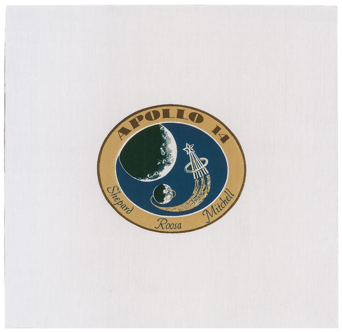 Unsigned 9 x 9 swatch of Beta cloth with a printed 4-inch diameter Apollo 14 mission emblem in the center. In fine condition.