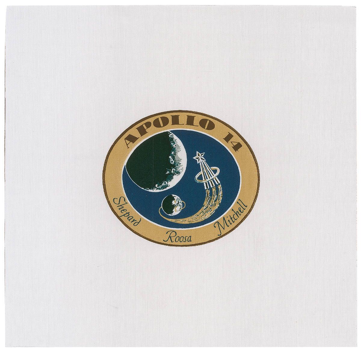Unsigned 9 x 9 swatch of Beta cloth with a printed 4-inch diameter Apollo 14 mission emblem in the center. In fine condition.
