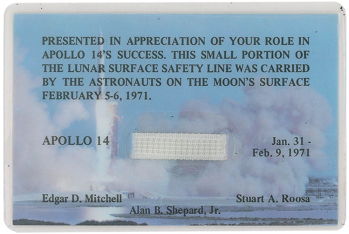 Flown one-inch long section of lunar surface safety line, carried on the surface of the moon during the Apollo 14 mission, presented to NASA employee Stephen T. Dunham. Swatch is laminated to a 3.25 x 2.75 presentation card reading “Presented in appreciation of your role in Apollo 14’s success. This small portion of the lunar surface safety line was carried by the astronauts on the moon’s surface February 5–6, 1971.” The card also shows a picture of the liftoff of the Apollo 14 mission, and the names and dates of the participants, Alan B. Shepard, Jr., Edgar D. Mitchell, and Stuart A. Roosa. In fine condition. The Lunar Surface Safety Line was a 100-foot long cord designed to be used in an emergency to allow one astronaut to pull another to safety. Despite the overall 100-foot size of the line, very few examples appear on the market.