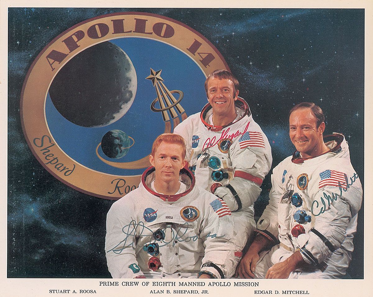 Color 10 x 8 NASA photo of the crew in their white space suits posing in front of their mission insignia, signed in red felt tip by Alan Shepard and in black felt tip by Ed Mitchell and Stu Roosa. In fine condition, with a bit of light contrast to portion of Roosa’s signature.