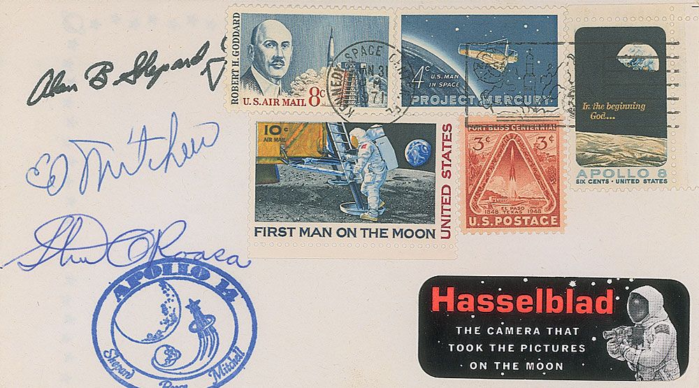 Commemorative cover with a stamped cachet of the Apollo 14 mission, signed in blue ballpoint by Ed Mitchell and Stu Roosa. Cover also bears an autopen signature of Alan Shepard, as well as a Hasselblad sticker affixed to lower right. In fine condition.