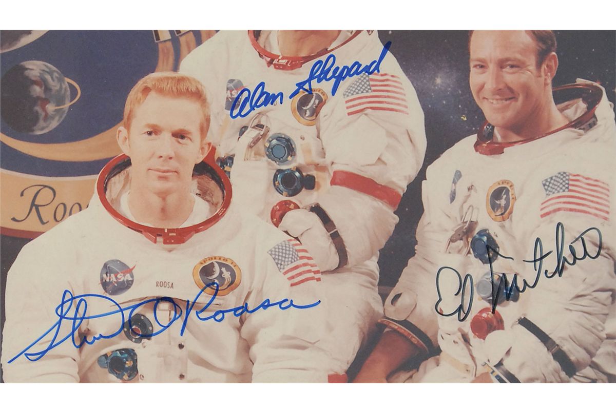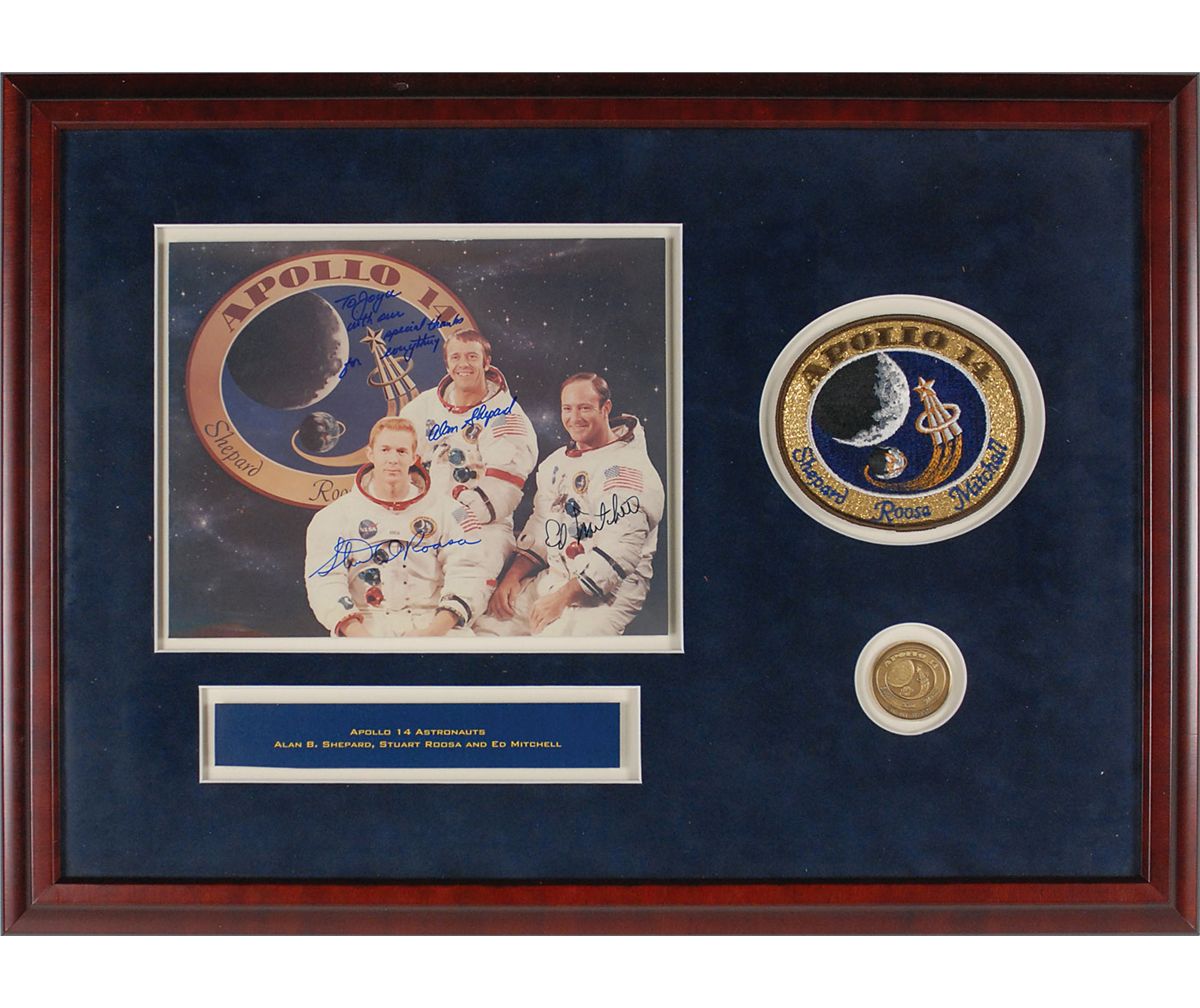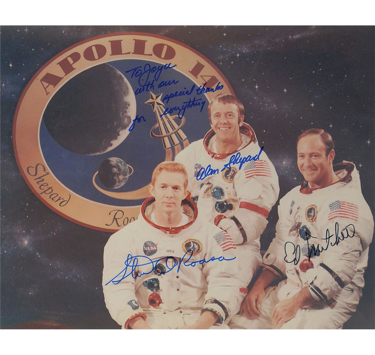 Color glossy photo of the Apollo 14 crew in their white space suits posing in front of their mission insignia, trimmed to a size of 9.25 x 7.5, signed and inscribed in blue felt tip, “To Joyce, with our special thanks for everything, Alan Shepard,” and “Stu Roosa,” and in black felt tip, “Ed Mitchell.” Suede-matted and framed with an Apollo 14 patch, medallion, and a printed caption to an overall size of 22.5 x 16.5. In fine condition. Inscribed to longtime NASA employee Joyce Abrams, who was a senior member of the ground support team.