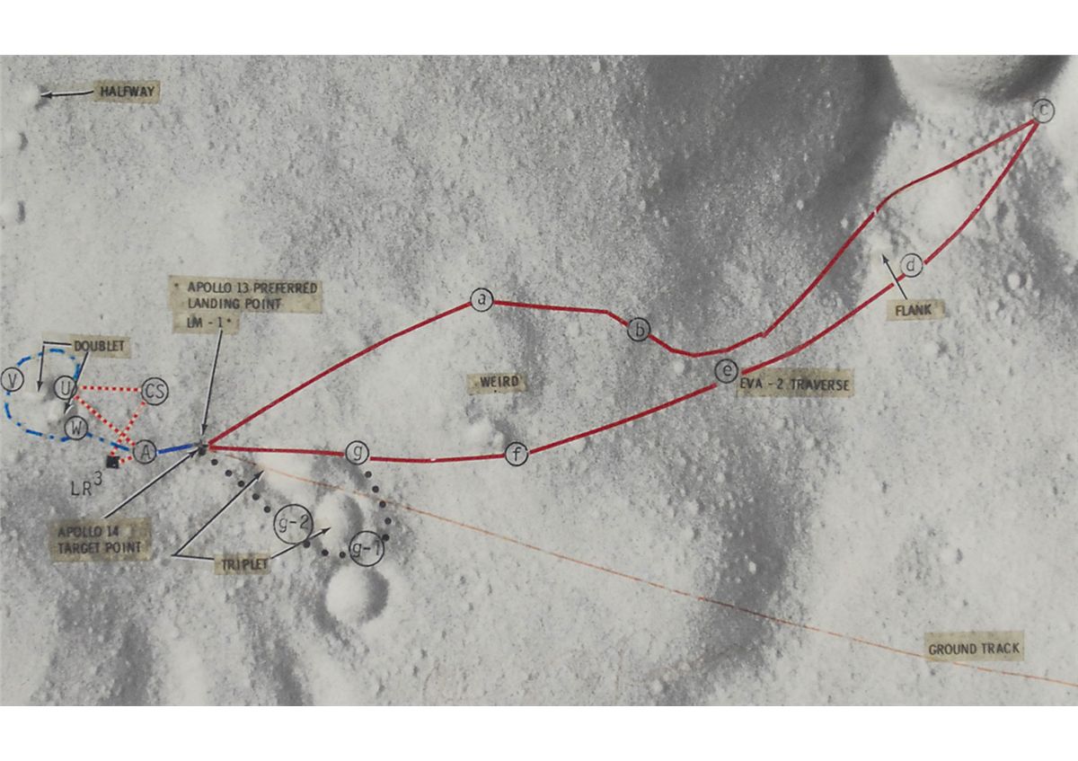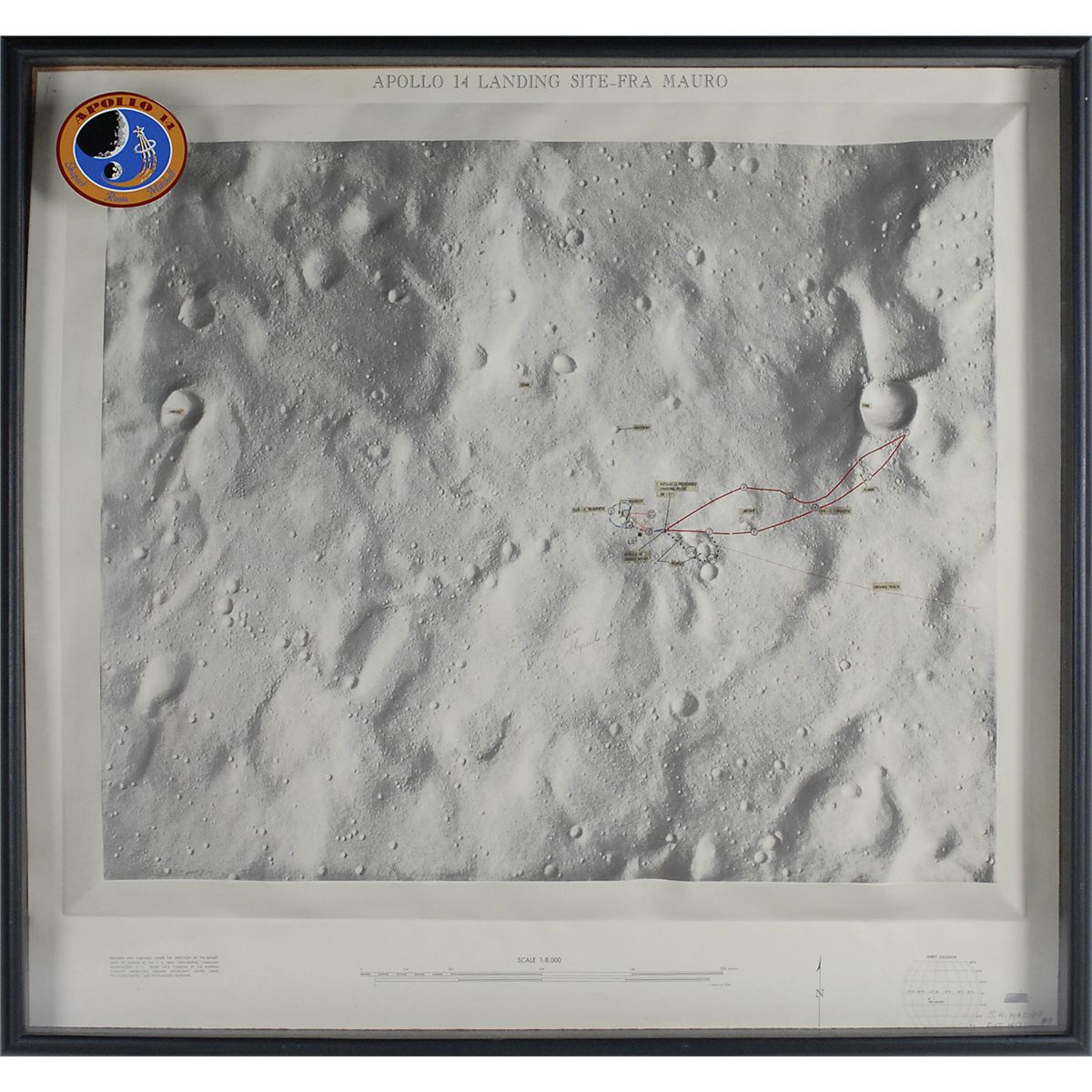 Amazing 3-D map of the Apollo 14 landing site at the Fra Mauro Highlands, 27.75 x 25.5, signed in ink by all three of the mission’s astronauts: Alan Shepard, Edgar Mitchell, and Stuart Roosa. The map’s surface is raised and lowered to follow the lunar landscape and craters, and the path of the astronauts’ journey is labeled with a red line. Framed to an overall size of 28 x 30. Shepard and Mitchell signatures light but legible, a slight brush to Shepard’s signature, and Roosa’s signature very faded with only portions visible, otherwise fine condition. In addition to its impressive size and unusual topography, the most interesting element of this map is that it shows the path that Shepard and Mitchell took during their second moonwalk, during which they attempted to find the 1,000-foot wide Cone Crater. Due to the irregular slopes and hills of the surface, they struggled to find the crater’s rim and turned around. As seen here, they came extremely close to reaching their destination—now estimated within 30 meters—before abandoning the journey. Because this confusion was caused by the moon’s terrain, this style of three-dimensional map is an especially appropriate Apollo 14 item.