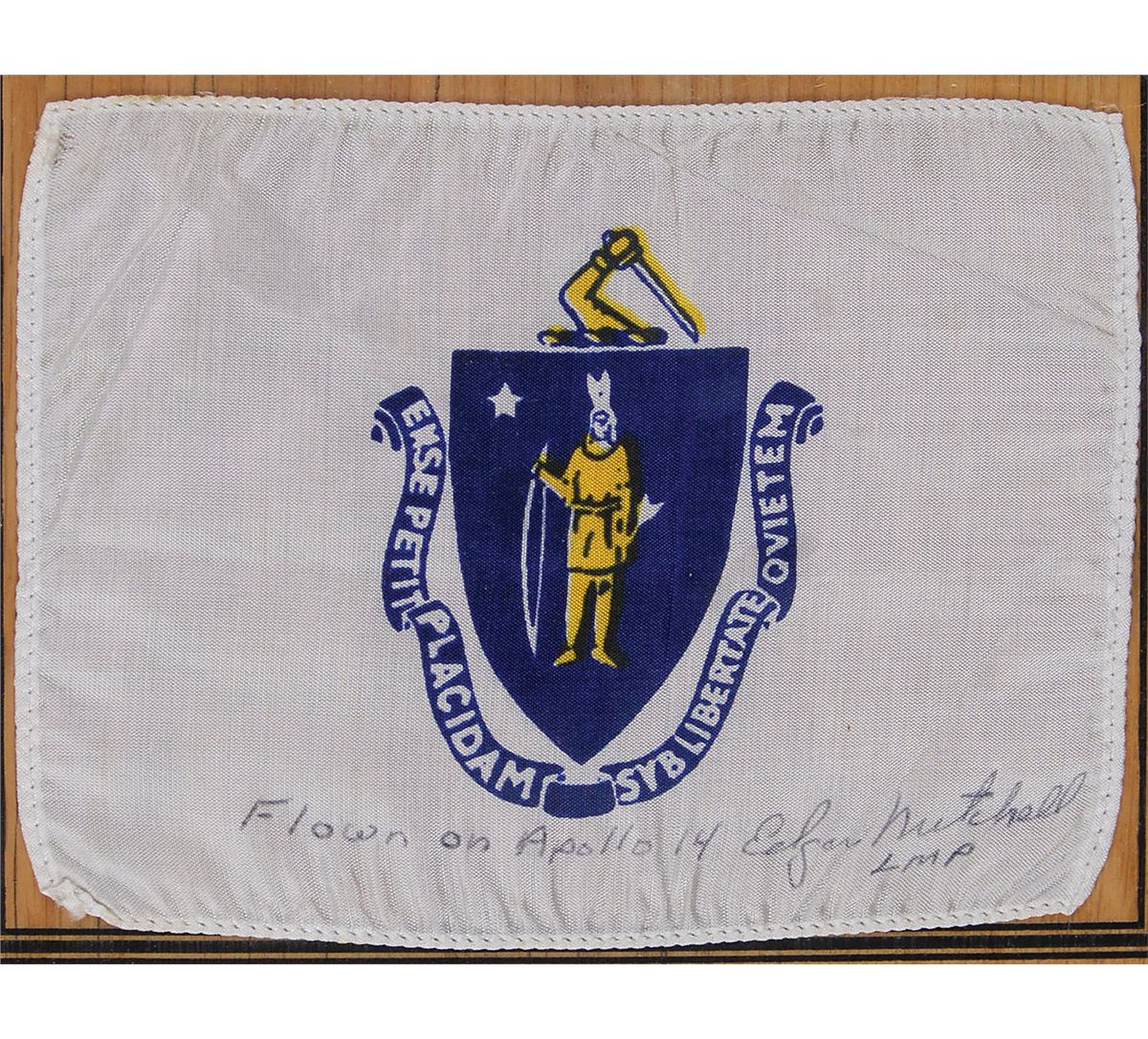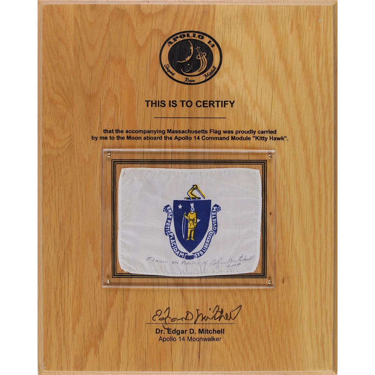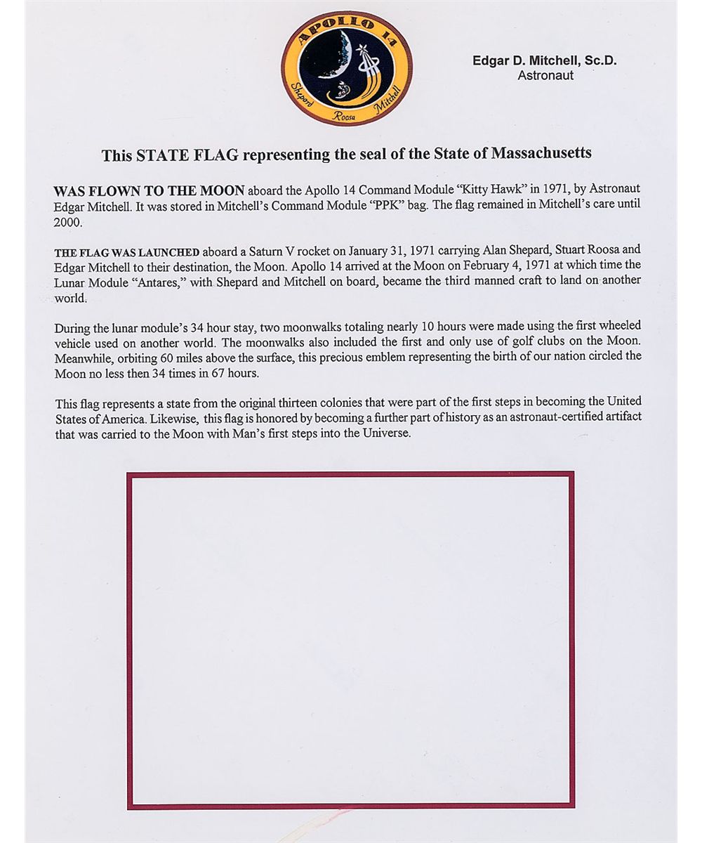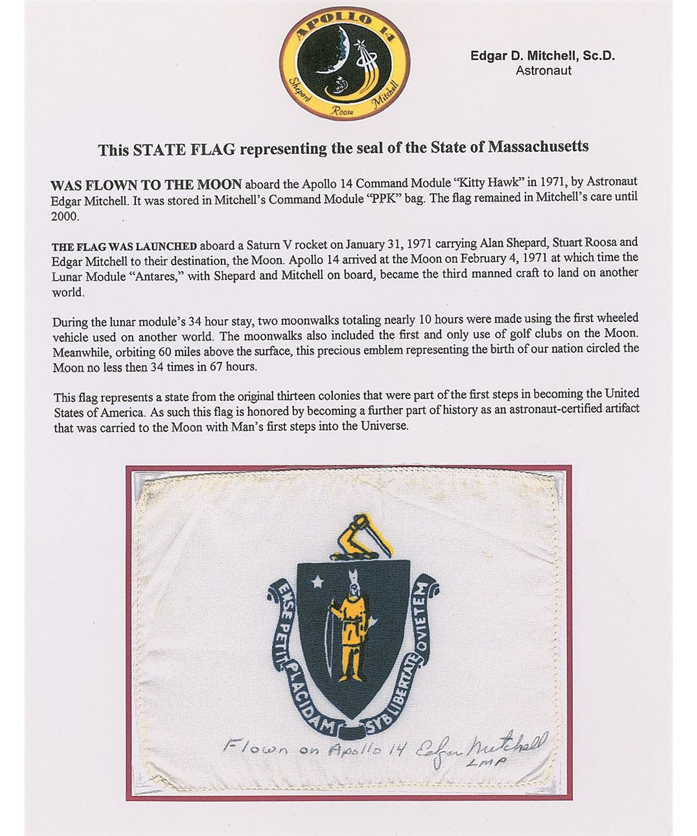 Flown printed fabric Massachusetts state flag, 5.5 x 4, carried to the moon on board ‘Kitty hawk’ during the Apollo 14 mission. Flag is signed along the bottom, “Flown on Apollo 14 Edgar Mitchell LMP.” Flag is presented behind Lucite on a beautiful 12 x 5 engraved wooden presentation plaque, which is signed at the bottom in black felt tip by Mitchell. Also accompanied by an unsigned certificate of authenticity from Mitchell which reads, in part: “This State Flag…was flown to the moon aboard the Apollo 14 Command Module…by astronaut Edgar Mitchell. It was stored in Mitchell’s PPK bag. The flag remained in Mitchell’s care until 2000.” In fine condition.