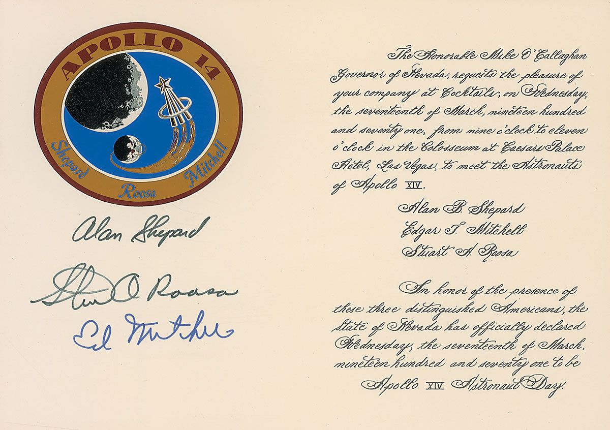 Invitation to a cocktail reception given by the governor of the state of Nevada, Mike O’Callaghan, 10 x 7.25, given on March 17, 1971, in honor of the Apollo 14 astronauts, held at Caesars Palace. Signed in felt tip on the left side under a mission emblem sticker by Alan Shepard, Stu Roosa, and Ed Mitchell. In fine condition.