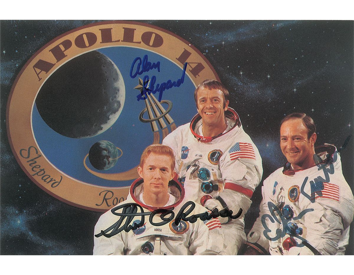 Color 6 x 4 postcard photo, signed in blue felt tip by Alan Shepard and in black felt tip by Alan Bean and Stu Roosa. In fine condition.