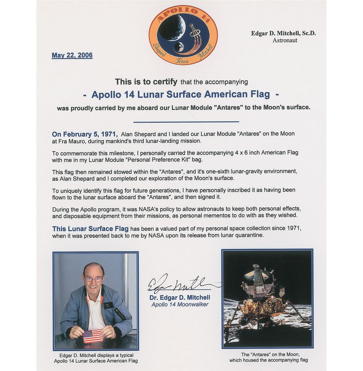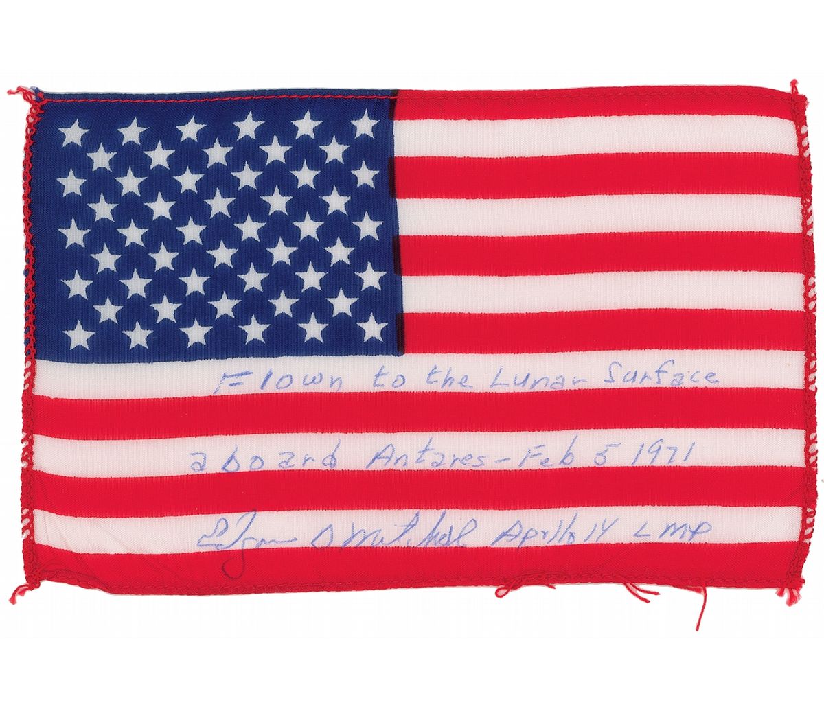 Rare and exceptionally desirable flown American flag carried on board Apollo 14, 6 x 4, signed and flight-certified in blue ballpoint by Lunar Module Pilot Edgar Mitchell, in full: "Flown to the Lunar Surface aboard Antares—Feb. 5, 1971. Edgar Mitchell, Apollo 14 LMP." In fine condition, with some wrinkles to corners. Accompanied by a letter of authenticity signed by Edgar Mitchell, in part: "This is to certify that the accompanying Apollo 14 Lunar Surface American Flag was proudly carried by me aboard our Lunar Module 'Antares' to the Moon's surface. On February 5, 1971, Alan Shepard and I landed our Lunar Module 'Antares' on the Moon at Fra Mauro…To commemorate this milestone, I personally carried the accompanying 4 x 6 inch American Flag with me in my Lunar Module 'Personal Preference Kit' bag. This flag then remained stowed in within the 'Antares'…as Alan Shepard and I completed our exploration of the Moon's surface…This Lunar Surface Flag has been a valued part of my personal space collection since 1971." American flags are among the most coveted flown relics from the Apollo missions, particularly those which reached the lunar surface rather than remaining in orbit.