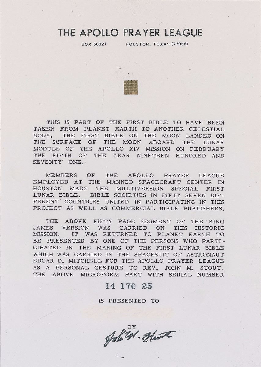 Highly desirable fifty-page segment of a microfilmed King James Bible carried to the lunar surface by Edgar Mitchell, affixed to an Apollo Prayer League presentation card measuring 5 x 7. The card notes that the serial number of this piece is “14 170 25,” and reads, in part: “This is part of the first Bible to have been taken from planet Earth to another celestial body…The above 50 page segment of the King James Version…was carried in the spacesuit of astronaut Edgar D. Mitchell for the Apollo Prayer League as a personal gesture to Rev. John M Stout.” Signed at the conclusion in black ink by Stout. In fine condition. The famous ‘First Lunar Bible’ was produced by the Apollo Prayer League, a group of NASA engineers, scientists, administrators, and astronauts. Containing 50 pages of the King James Bible, this microfilm can easily be read under a microscope and represents the first and only Bible to fly to the lunar surface.