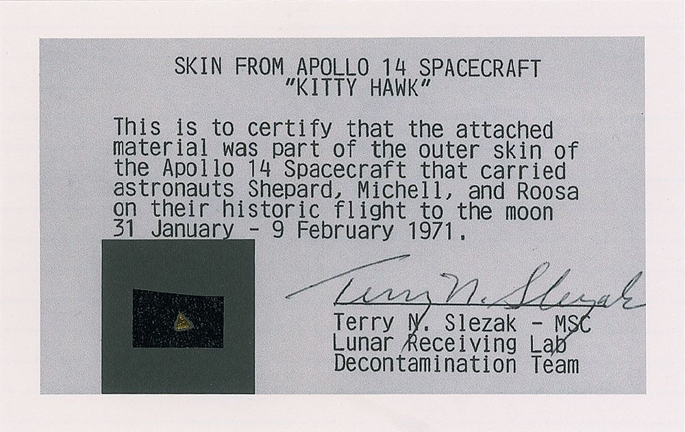 Flown swatch of outer skin material from the Apollo 14 spacecraft Kitty Hawk, .25 x .25, affixed to a 5.5 x 3.5 card, which is signed and flight-certified on the reverse in blue ballpoint by Florian Noller of spaceflori.com. In fine condition.