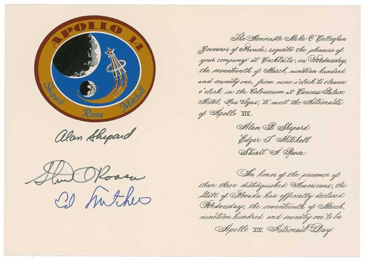 Invitation to a cocktail reception given by the governor of the state of Nevada, Mike O’Callaghan, 10.5 x 7.25, given on March 17, 1971, in honor of the Apollo 14 astronauts, at Caesars Palace, signed on the left side under a mission emblem sticker by Alan Shepard, Stu Roosa, and Ed Mitchell. In fine condition. Pre-certified Scott Cornish and RRAuction COA.