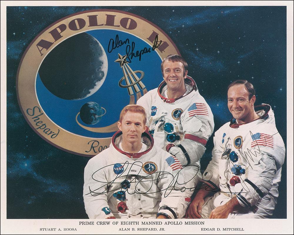 Color 10 x 8 NASA photo of the Apollo 14 crew posing in their space suits with their mission emblem, signed in black felt tip by Alan Shepard, and in black ink by Edgar Mitchell and Stu Roosa. In fine condition, with Mitchell’s signature a shade light, but completely legible. Pre-certified Scott Cornish and RRAuction COA.