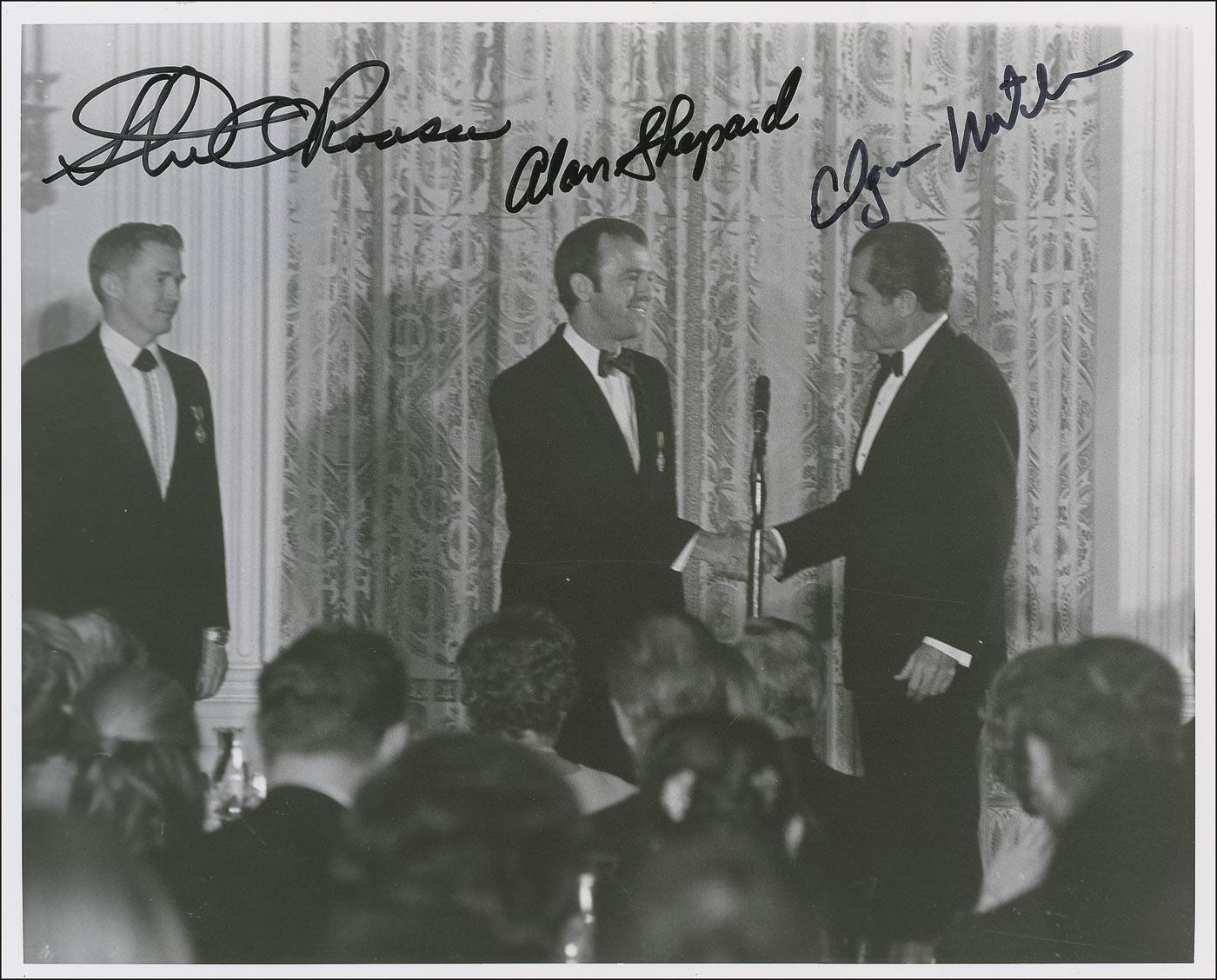 Glossy 10 x 8 NASA photo of Alan Shepard shaking hands with Richard Nixon after being awarded the NASA Distinguished Service Medal, signed in black felt tip by Alan Shepard, Edgar Mitchell, and Stu Roosa. In fine condition.