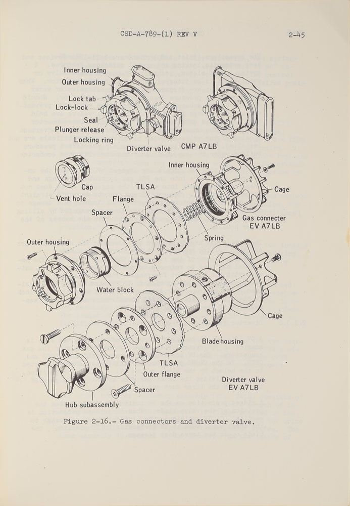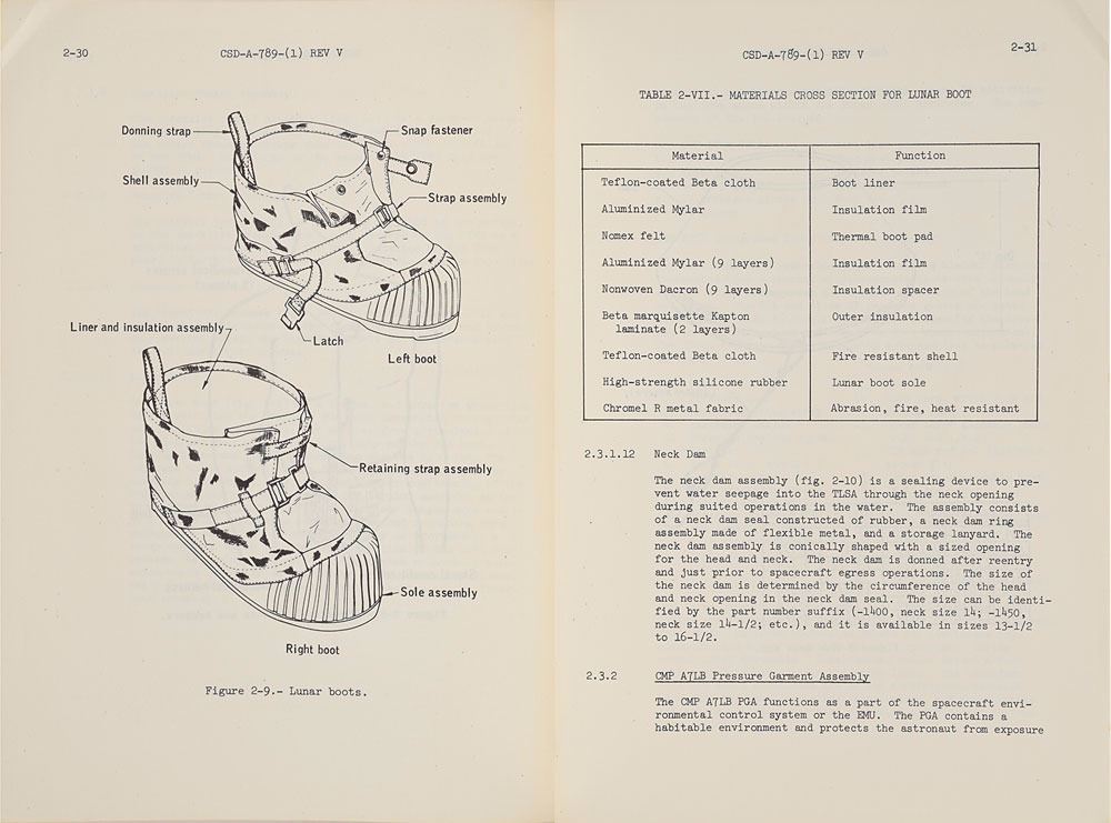 Staple-bound manual entitled "Apollo Operations Handbook, Extra Vehicular Mobility Unit," 123 pages, 8 x 10.5, March 1971, with subtitle reading: "Volume I, System Description, CSD-A-789-(1), Apollo 15–17. Crew Systems Division, Original Issue August 1968, Revision V." The manual provides details on the Extravehicular Mobility Unit subsystems and accessories, including the pressure suit, lunar boots, Portable Life Support System (PLSS), biomedical instrumentation system, and other systems, and features numerous schematics and diagrams. In fine condition. From the collection of Dan Schaiewitz, who worked as Extravehicular Crew Training Engineer at KSC.