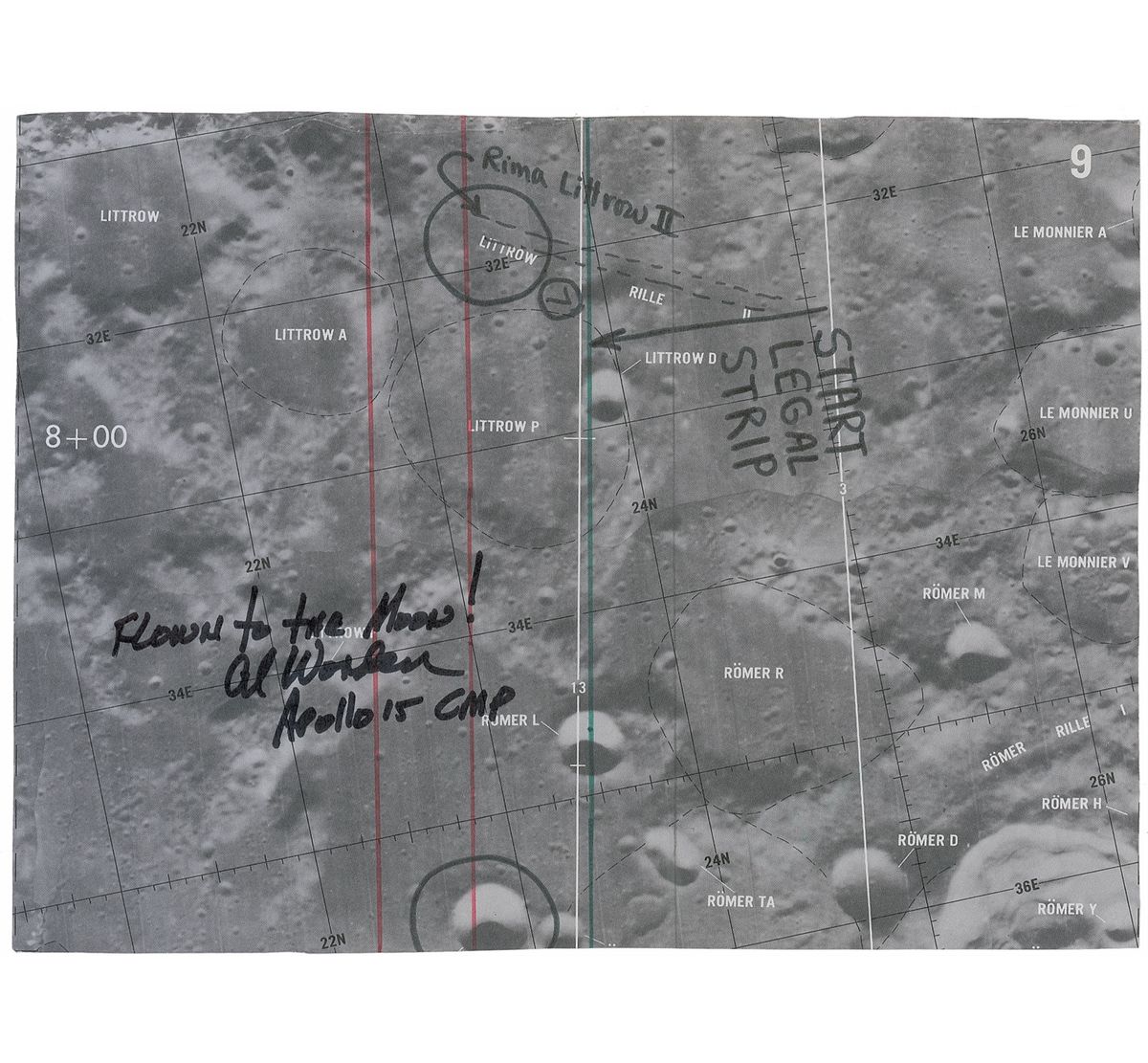 Flown lunar map section used during the Apollo 15 flight, 10.5 x 7.75, signed in black felt tip, “Flown to the Moon! Al Worden, Apollo 15 CMP.” The map depicts the Littrow Rille area of the lunar surface, with the Romer and Le Monnier regions also shown; it is also hand-labeled in black ink, "Rima Littrow II" and "Start Legal Strip." In fine condition. Accompanied by a letter of provenance signed by Worden, in part: “This Lunar Map was used during the historic flight of Apollo 15…Our mission included the introduction of a Lunar Roving Vehicle to traverse the Moon’s surface and a scientific instrument bay in the Service Module to study the Moon from above…Apollo 15 has been recognized as the most scientific flight of the Apollo missions.” Also accompanied by a photo of Worden holding the map. This is an especially important map in Apollo history, as Worden's observations of the Littrow region while orbiting the moon were key in determining the landing site for the Apollo 17 mission—he noticed that the valley contained numerous craters, potentially linking it to volcanic activity, and the primary objective of Apollo 17 became investigating this possibility. The Apollo 17 landing site eventually chosen was about 100 kilometers from the area depicted here. An exceptional piece flown to the moon, associated with one of the most important discoveries of the mission.