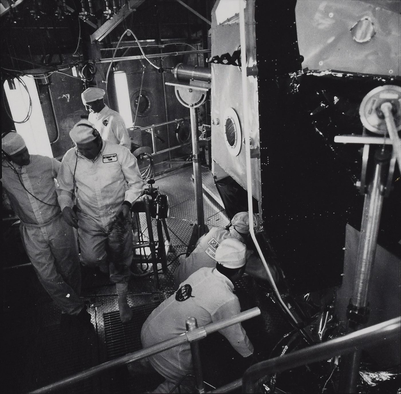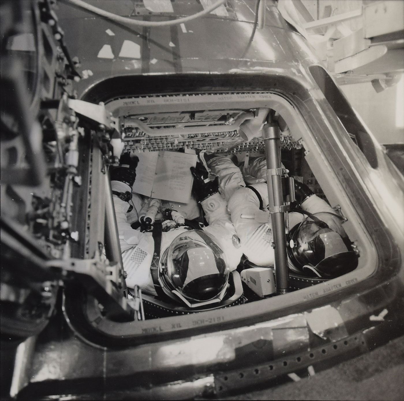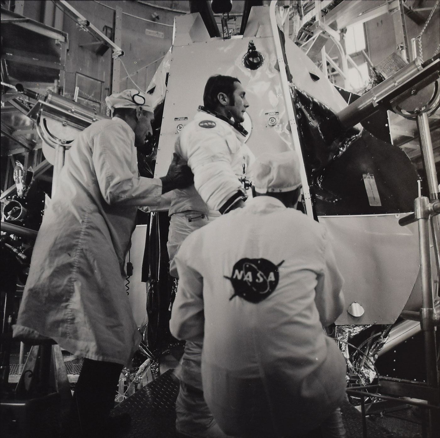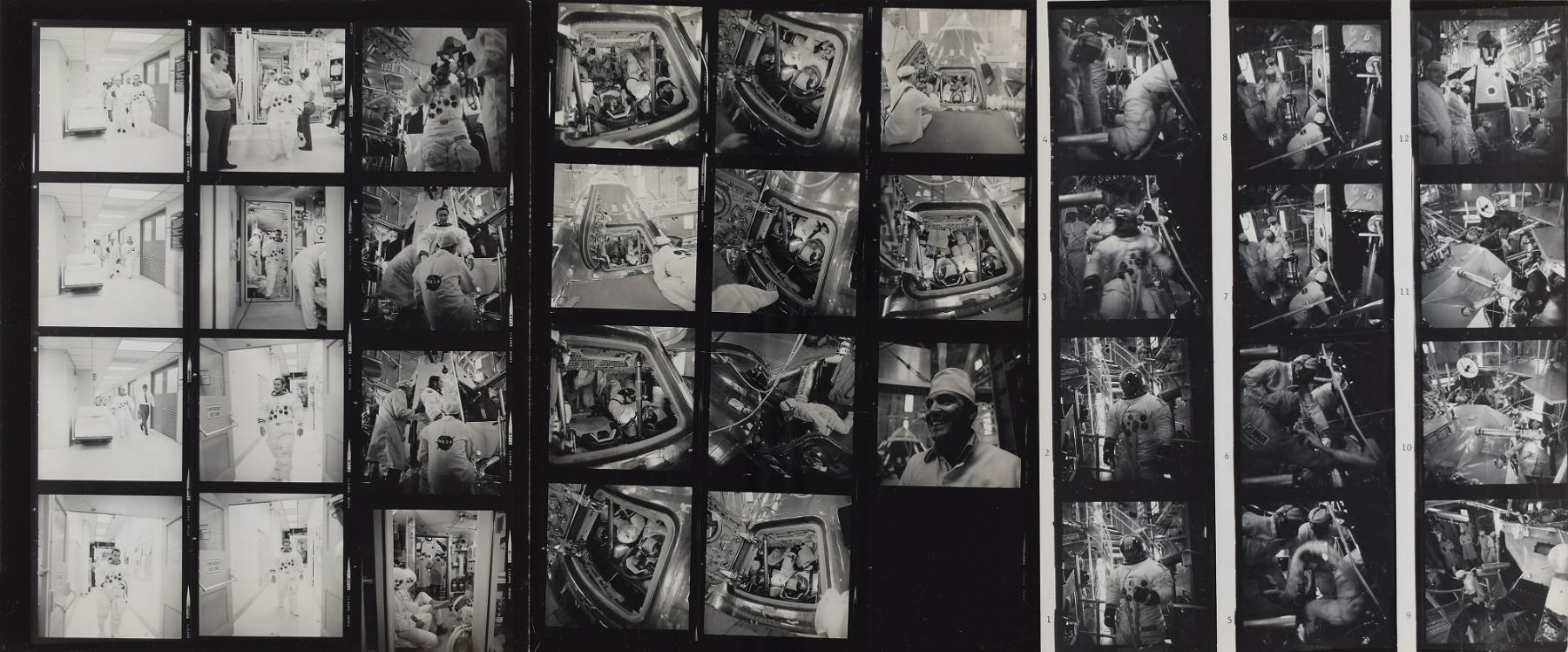 Three vintage original glossy 8 x 10 NASA contact sheets, each containing 12 images of the Apollo 15 backup crew of Richard Gordon, Vance Brand, and Harrison Schmitt as they undergo altitude chamber tests at the Kennedy Space Center. Reverse of each bears purple NASA caption text. In overall fine condition.