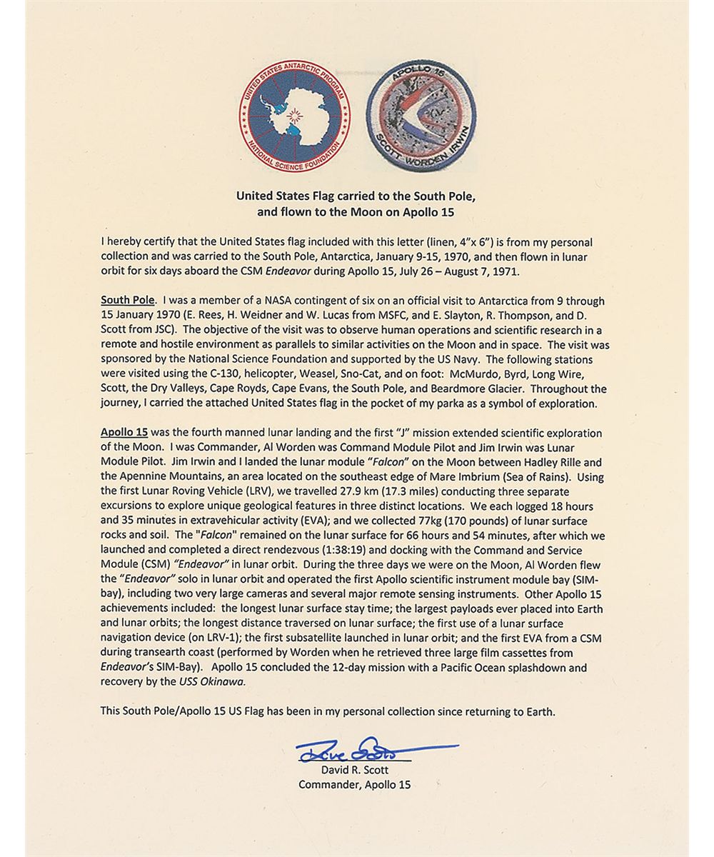 Flown printed fabric American flag, 5.5 x 4, carried to the South Pole in 1970, and flown to lunar orbit during the Apollo 15 mission. Flag is signed on three white stripes in blue ink, “Dave Scott, carried to South Pole, Antarctica, Jan 9–15, 1970. Flown to the moon aboard Apollo 15, July 26–Aug 7, 1971.” Accompanied by a letter of authenticity from Dave Scott stating, in part, “I hereby certify that the United States flag included with this letter…is from my personal collection and was carried to the South Pole, Antarctica…and then flown in lunar orbit for six days aboard the CSM Endeavour during Apollo 15…I was a member of the NASA contingent of six on an official visit to Antarctica from 9 through 15 January 1970…Throughout the journey, I carried the attached United States flag in the pocket of my parka as a symbol of exploration…This South Pole/Apollo 15 US flag has been in my personal collection since returning to Earth.” In fine condition. Flags carried on any Apollo mission are highly desirable, with this particular flag making an extra trip to the bottom of the world.