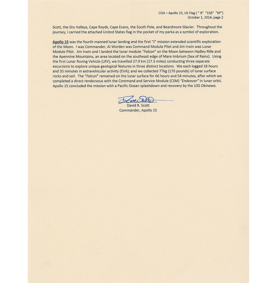 Flown American flag, 5.5 x 4, flown to the lunar surface during the Apollo 15 mission, flown on board Apollo 9, and carried to the South Pole in 1970. Scott has identified the flag as such by writing the following symbols on the reverse lower right corner, “9,” [Apollo 9] “15?,” [Apollo 15, Delta] and “SP” [South Pole]. Accompanied by a signed letter of authenticity from Dave Scott stating, in part, “I hereby certify that the United States flag included with this letter…is from my personal collection and was flown aboard Apollo 9…then carried to the South Pole, Antarctica…and then flown to the lunar surface during Apollo 15…This specific flag is identified by the following handwritten symbols on the reverse lower right corner of the flag beneath the star field: ‘9’ ‘15?’ ‘SP.’ The symbol ‘9’ means that the flag was carried on Apollo 9...it was then carried to the South Pole...’SP’ during which I was a member of a NASA management team observing the manner in which science is conducted in a hostile environment...and on Apollo 15...I carried this flag in the pocket of my spacesuit during all EVA excursions including climbing Hadley Delta Mountain to the highest point we reached on the Moon, thus the symbol ‘15?.’” In fine condition. An incredibly well-traveled flag, with the distinction of having accompanied Commander Scott during all Apollo 15 EVA excursions, including the climbing of Hadley Delta Mountain.