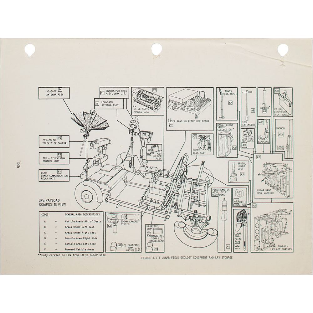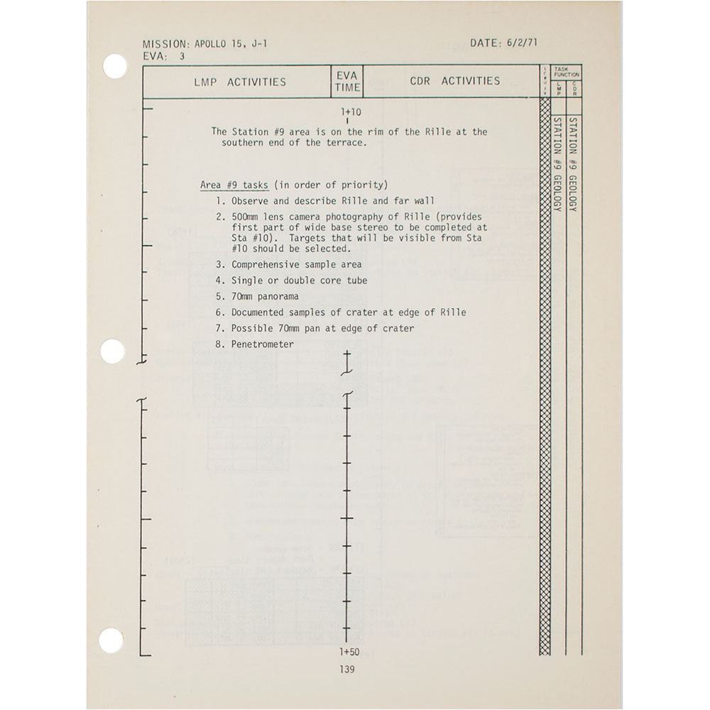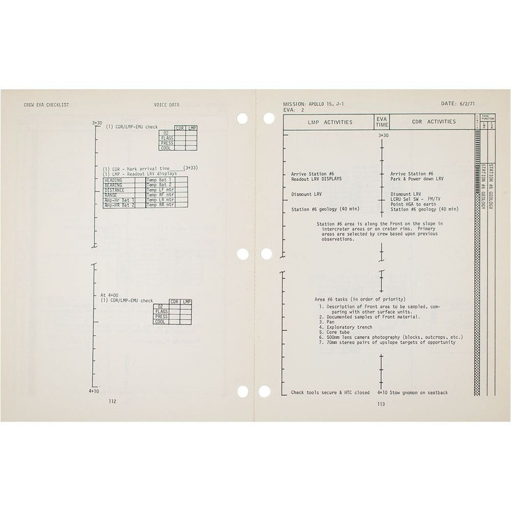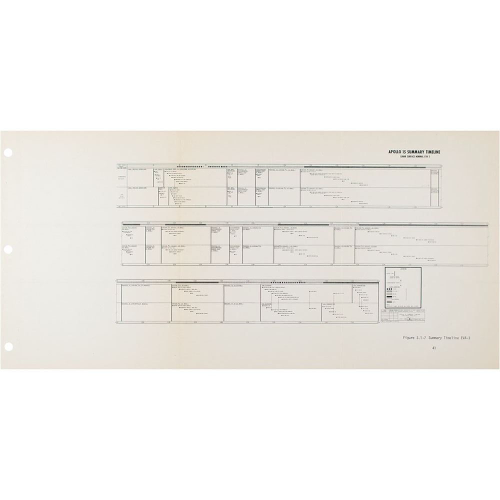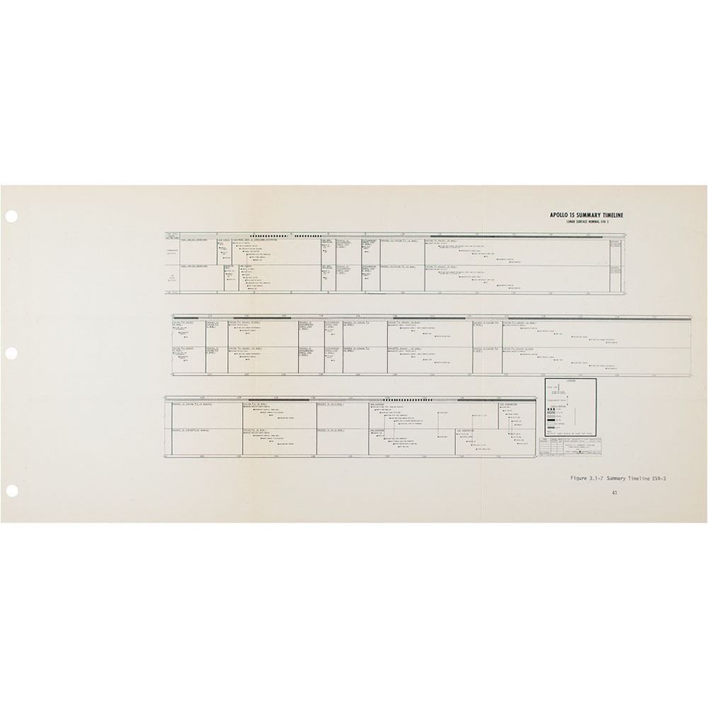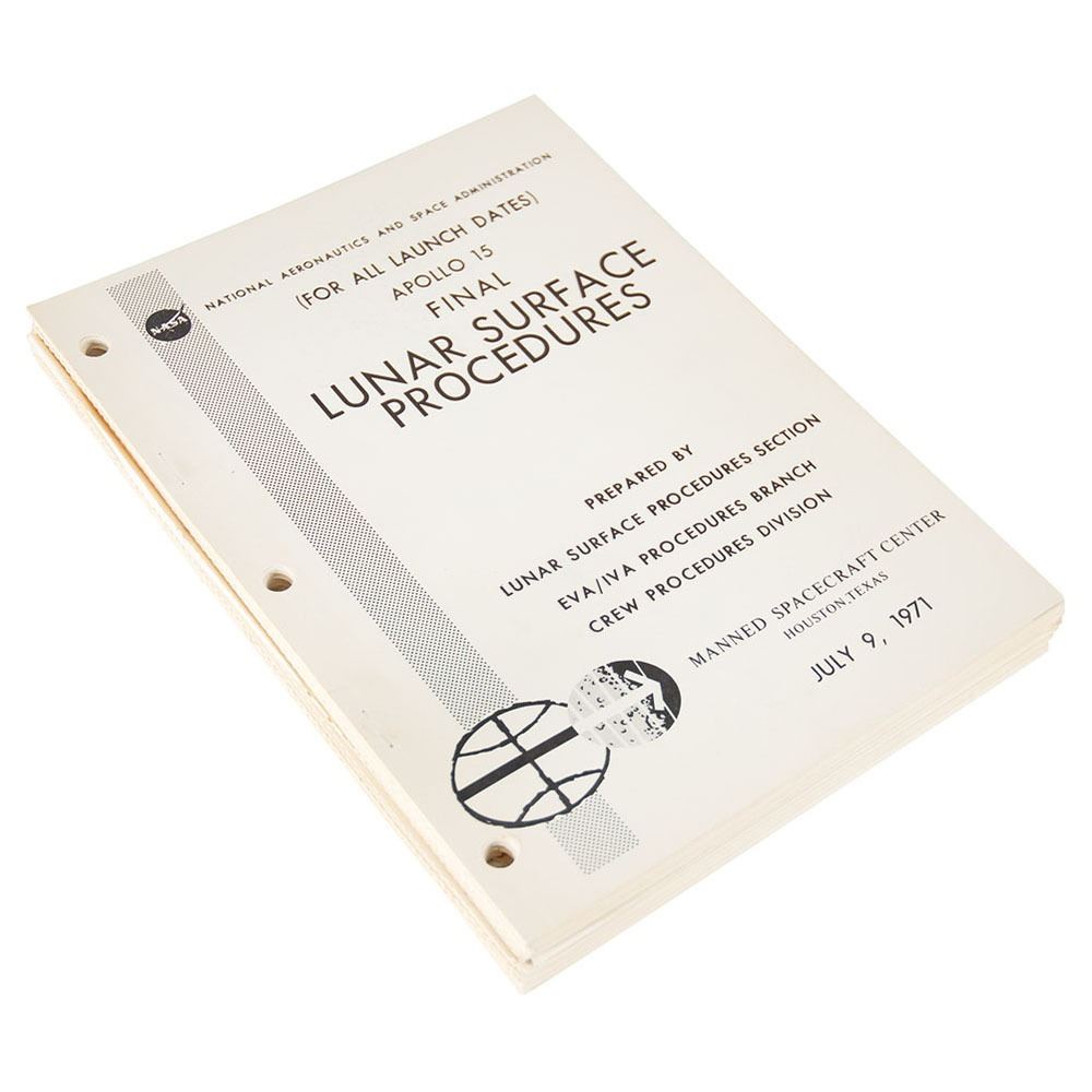 A disbound manual entitled, "(For All Launch Dates) Apollo 15 Final Lunar Surface Procedures," 8 x 10.5, 409 pages, dated July 9, 1971. This manual consists of five sections‰ÛÓIntroduction, Mission Description, Nominal Lunar Surface EVA, Contingent Plans, and Appendix‰ÛÓand extensively covers the various procedures for tasks performed by the crew of the Lunar Module Falcon, including: "Mission Lunar Surface Priorities," "EVA Requirements," "Lunar Landing Site Description," "EVA General Description," "Lunar Surface Photography Data," "EVA Traverses," and "Lunar Rover Vehicle." In fine condition, with rust stains and a torn binder hole to back cover; originally bound with staples, the manual now bears staple holes to left edge of each page and cover.