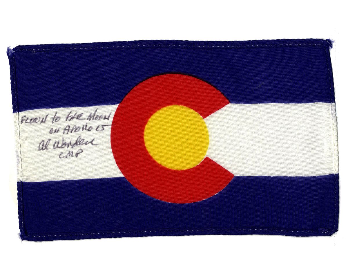 Apollo 15 Flown 6'' x 4'' Colorado State Flag -- Signed & Inscribed ''Flown to the Moon on Apollo 15 / Al Worden CMP'' by NASA Astronaut Al Worden -- Near Fine -- Also With COA by Worden