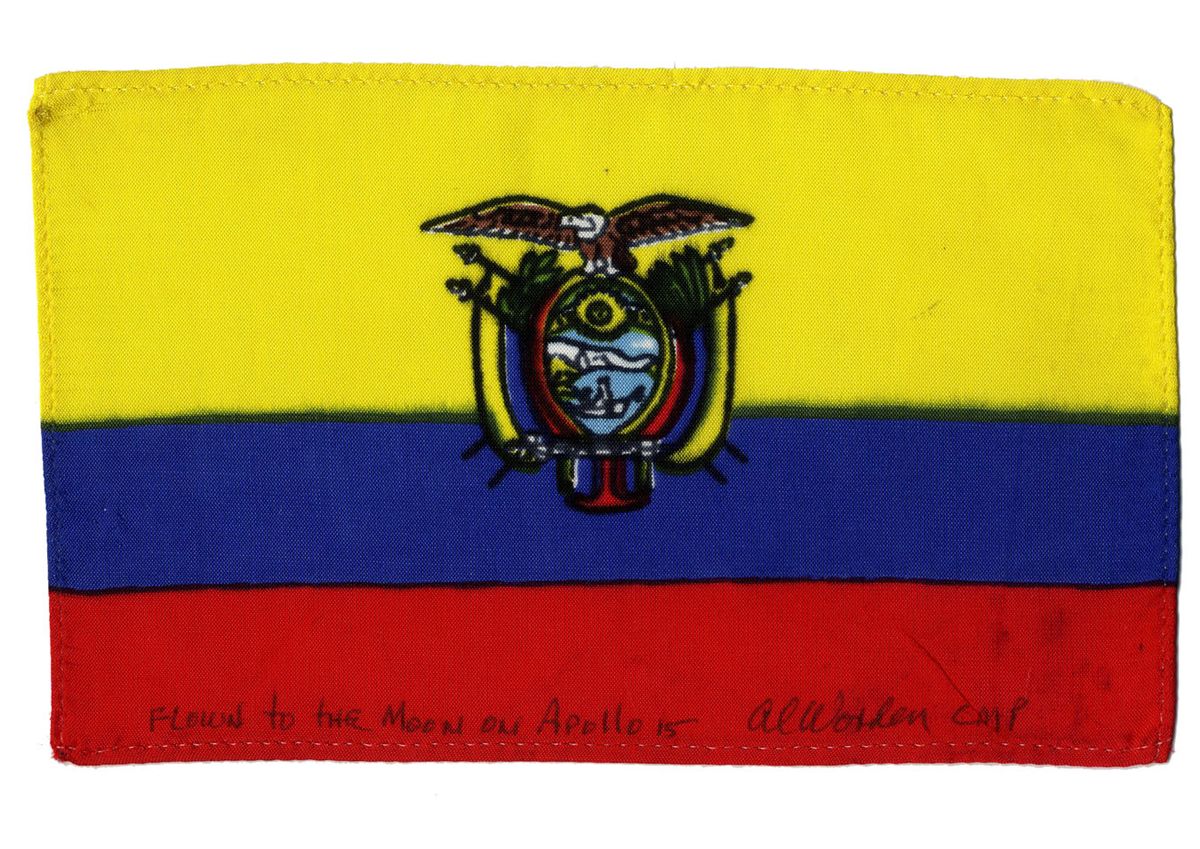 Apollo 15 Flown 6'' x 4'' Ecuador Flag -- Signed & Inscribed ''Flown to the Moon on Apollo 15 Al Worden CMP'' by NASA Astronaut Al Worden -- Near Fine -- Also With COA by Worden