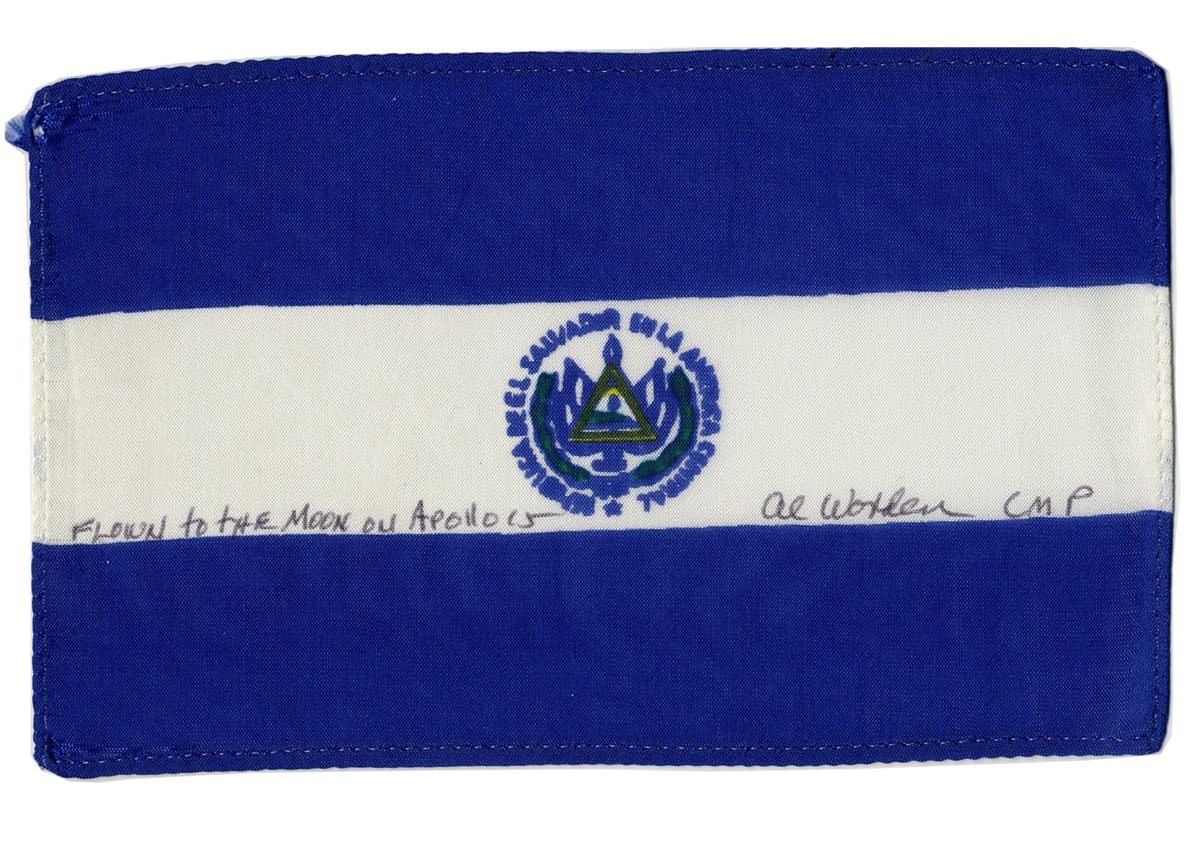 Apollo 15 Flown 6'' x 4'' El Salvador Flag -- Signed & Inscribed ''Flown to the Moon on Apollo 15 Al Worden CMP'' by NASA Astronaut Al Worden -- Near Fine -- Also With COA by Worden