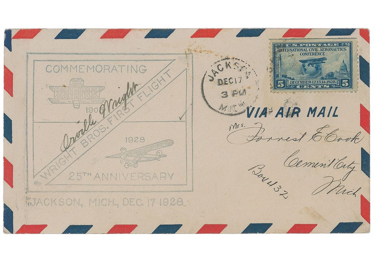 One-of-a-kind flown early airmail cover carried on the Apollo 15 mission, 6.5 x 3.5, with a stamped cachet commemorating the 25th anniversary of the Wright Bros. first flight and cancellation of December 17, 1928, signed on the cachet in fountain pen by Orville Wright. Some soiling to the right side, otherwise fine condition. This Orville Wright signed cover is well established as having been carried on Apollo 15 for a friend by Command Module Pilot Al Worden. The cover was originally sold at auction in 2007. An incredible association connecting manned spaceflight with its origin and the missing link for the flown Apollo cover completest.