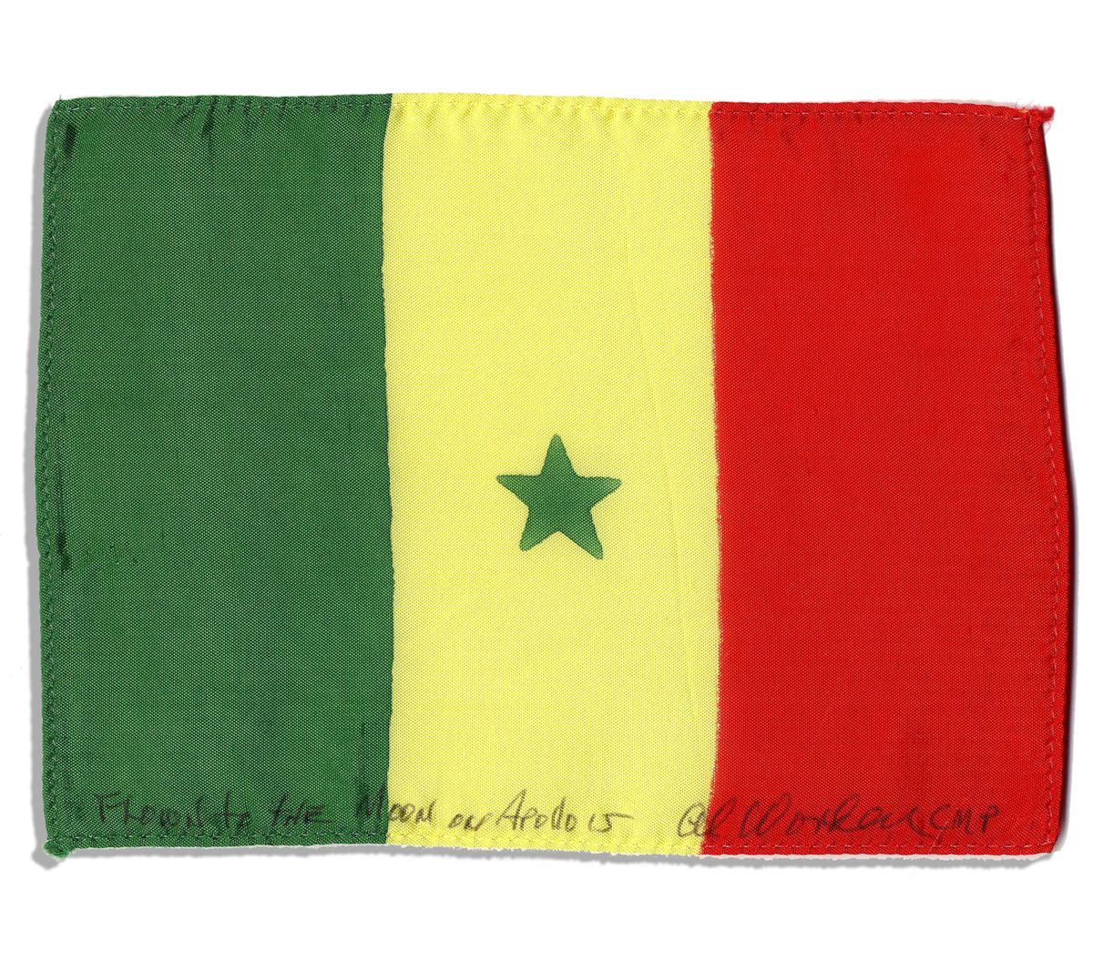 Al Worden Apollo 15 flown Senegal flag signed. Senegal flag bears the astronaut's autograph inscription, ''Flown to the Moon on Apollo 15 Al Worden CMP''. Measures 6'' x 4''. Near fine. With a COA from Worden.