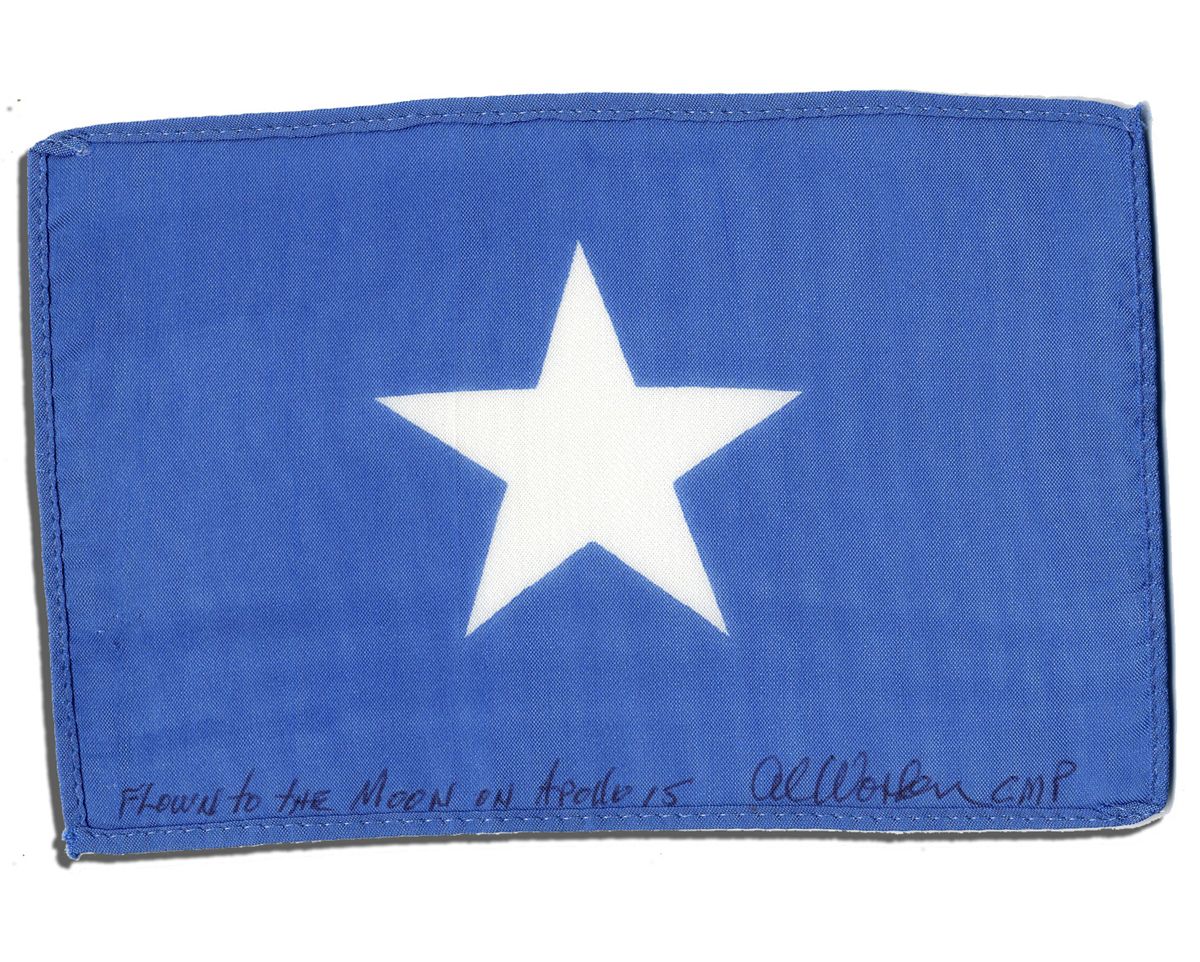 Al Worden Apollo 15 flown Somalia flag signed. Somalia flag bears the astronaut's autograph inscription, ''Flown to the Moon on Apollo 15 Al Worden CMP''. Measures 6'' x 4''. Near fine. With a COA from Worden.