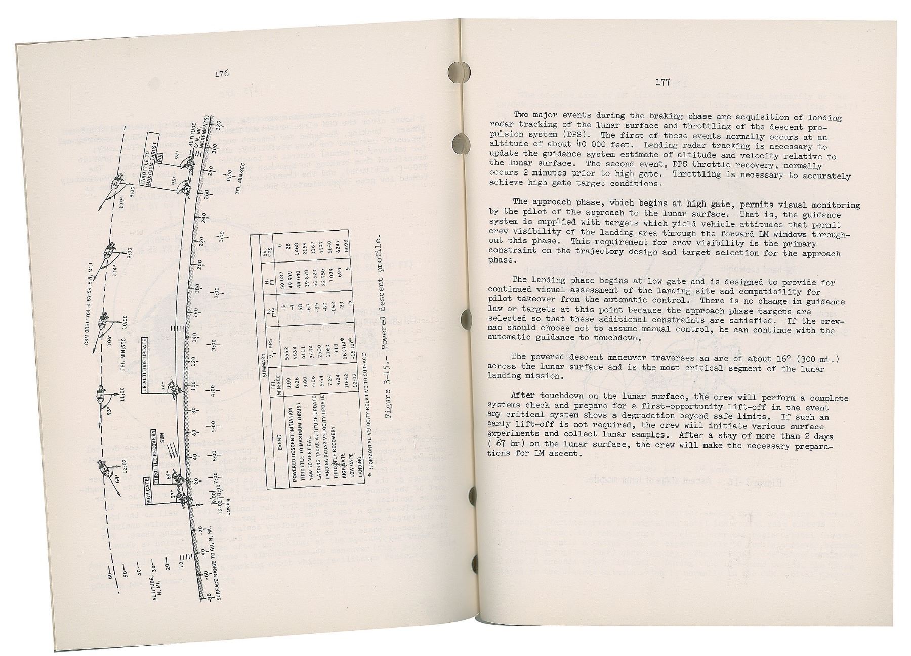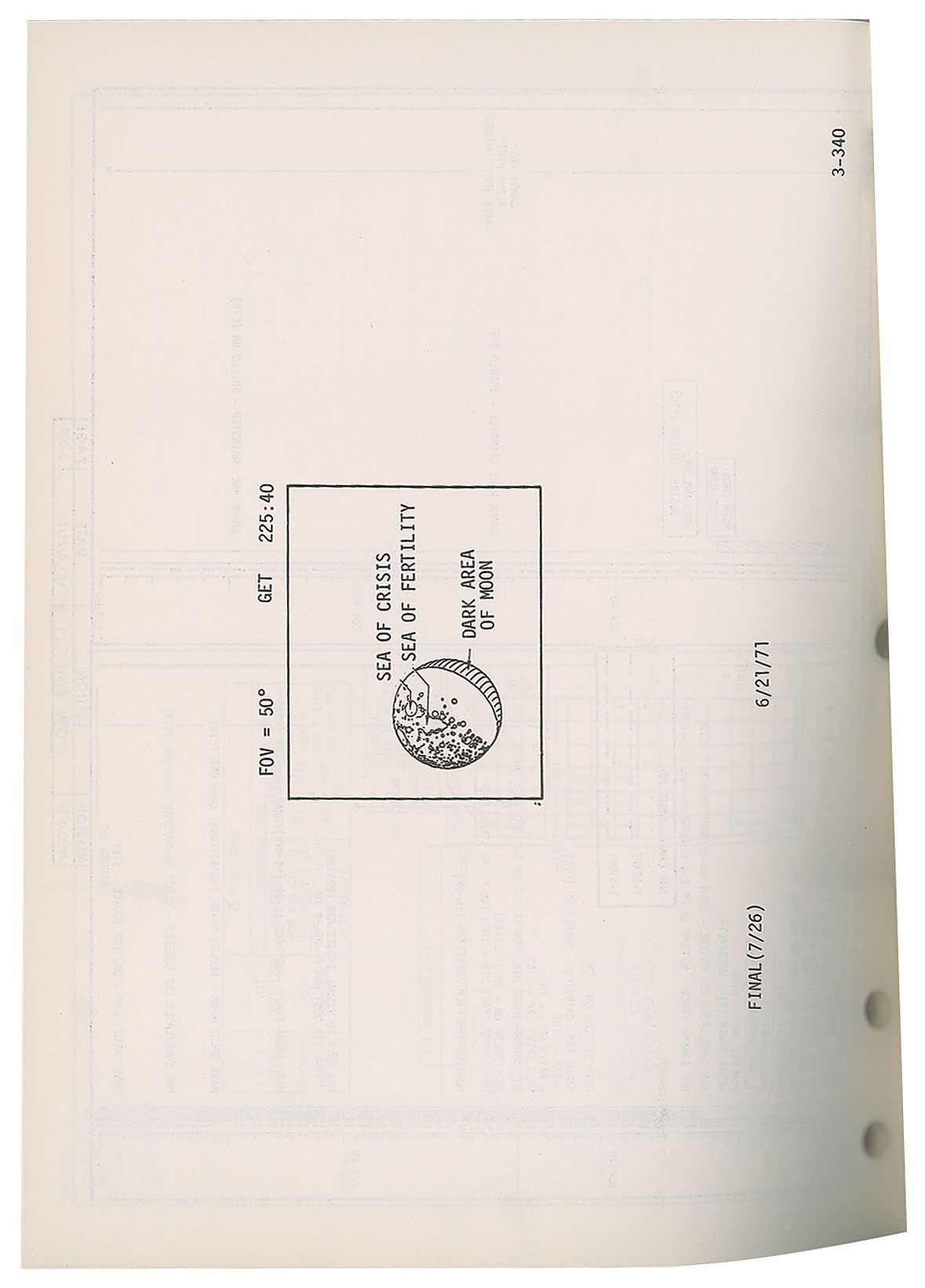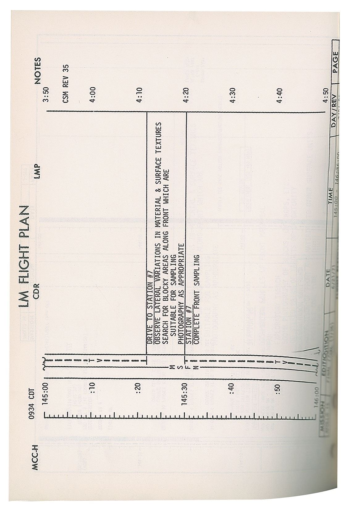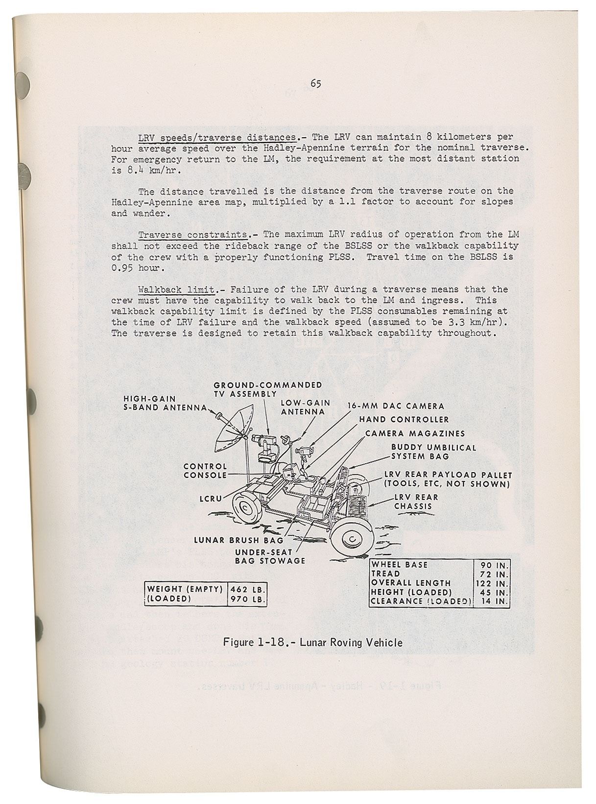 Ephemera associated with the Apollo 15 mission, comprising three NASA publications and six photos. Includes: an Apollo 15 Final Flight Plan prepared by the Flight Planning Section at Houston's Manned Spacecraft Center, June 21, 1971, 8 x 10.5, 467 pages, containing a detailed timeline for the mission, to include deploying the Lunar Roving Vehicle (LRV), deploying the American flag, driving to Geology Station 7 (where Genesis Rock was discovered), and departing from the moon to return to the Service Module; an Apollo 15 Lunar Trajectory Notes publication prepared by the Mission Planning and Analysis Division at Houston's Manned Spacecraft Center, June 30, 1971, 8 x 10.5, 215 pages, filled with interesting notes and diagrams related to numerous aspects of the mission; an Apollo 15 Preliminary Science Report (NASA SP-289), 7.75 x 10.25, 578 pages, depicting the 'Genesis Rock' inside (simply referred to as "sample 15415"); an original vintage glossy 10 x 8 red-numbered NASA photo of the Apollo 15 insignia, with "A Kodak Paper" watermarks on the reverse; four vintage glossy 10 x 8 photos of illustrations and diagrams related to the LRV; and a vintage 10 x 7.75 paperstock publicity print for Boeing, depicting the Lunar Roving Vehicle. In overall fine condition. Consignor notes that the three publications were purchased from the collection of Dutch news reporter Rudolf Spoor, and the photographs were purchased from the collection of NASA engineer Charles B. Mars (retired).