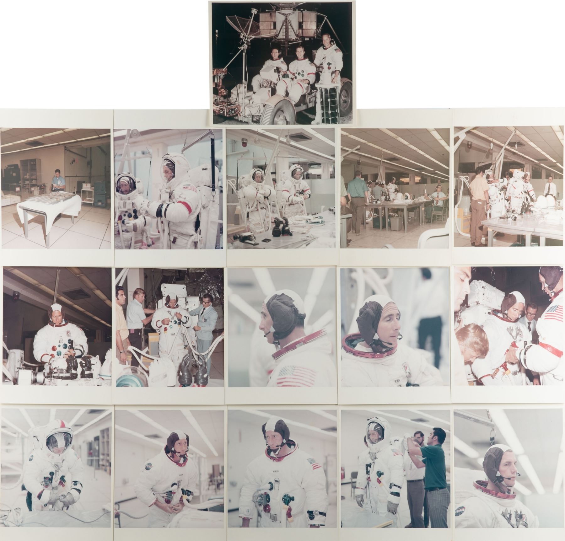 Desirable group lot of 16 original vintage color glossy NASA photos, 8 x 10 and 10 x 8, with the majority showing the Apollo 15 crew at the Kennedy Space Center’s Flight Crew Training Building during fit and function testing for their Extravehicular Mobility Unit (EMU) space suits. The lot consists of four images of LMP Jim Irwin, four images of CMP Al Worden, one image of CDR Dave Scott, and five of the two-man Lunar Module crew of Irwin and Scott going over their EMUs during training and testing exercises. Also included is a group image of the full crew wearing their white space suits and posing with the lunar rover and module. Reverse of each photo bears "A Kodak Paper" watermarks and purple NASA caption text. In overall fine condition.