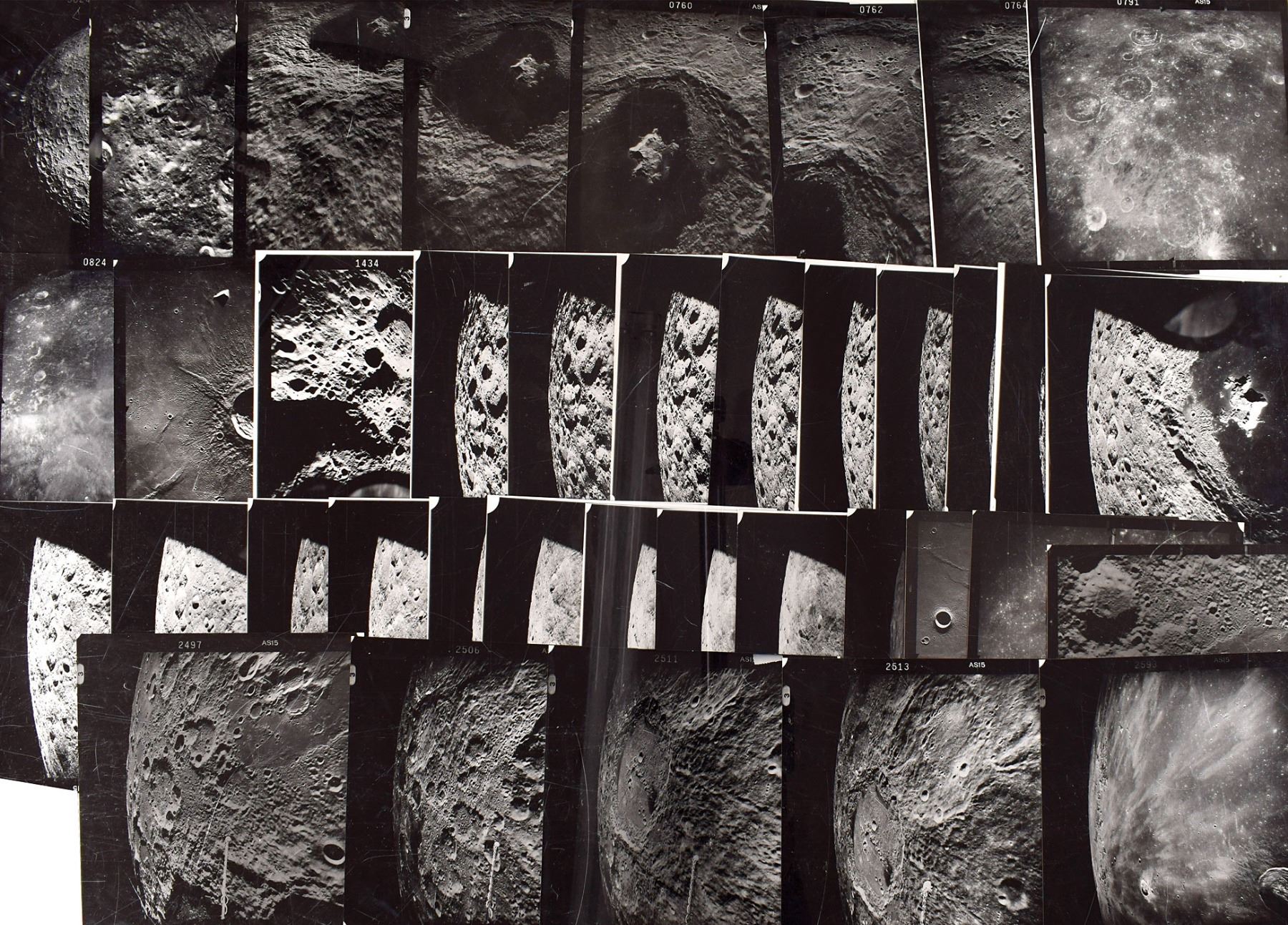 Collection of 37 vintage second-generation glossy 10 x 10 silver gelatin photographs taken by the Metric Mapping Camera during Apollo 15, featuring a number of consecutive sequences taken across the lunar surface, including one of the Hadley Rille landing site. Includes several images of the crater 'Tsiolkovskiy,' as well as the craters 'Lambert,' 'Lutke,' 'Delporte,' 'Chauvenet,' 'Perepelkin,' 'Auwers,' 'Menelaus,' 'Draper,' 'Pytheas,' and others. Also includes sunrise/sunset terminator sequences and stereo pairs. Each frame is identified in the border with its four-digit number and "AS15." In overall fine condition. Consignor notes that these photographs were acquired while working at the Manned Spacecraft Center from 1972–1974. These images were used by Planetary Scientists to not only help identify future landing sites, but also to understand the formation and evolution of the Moon.