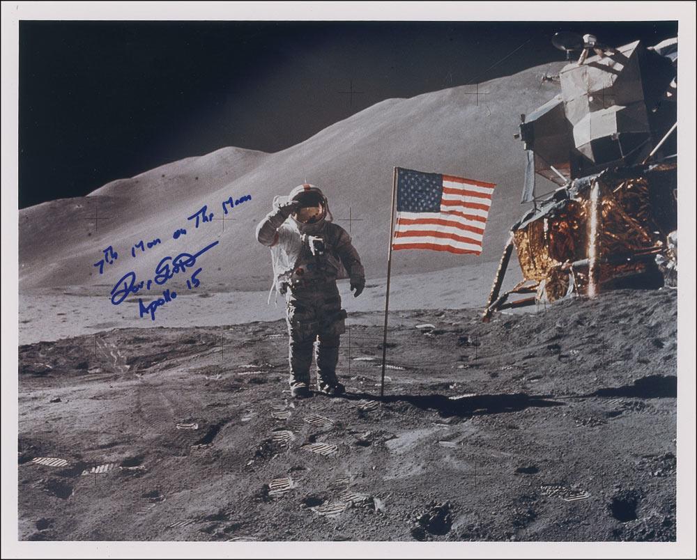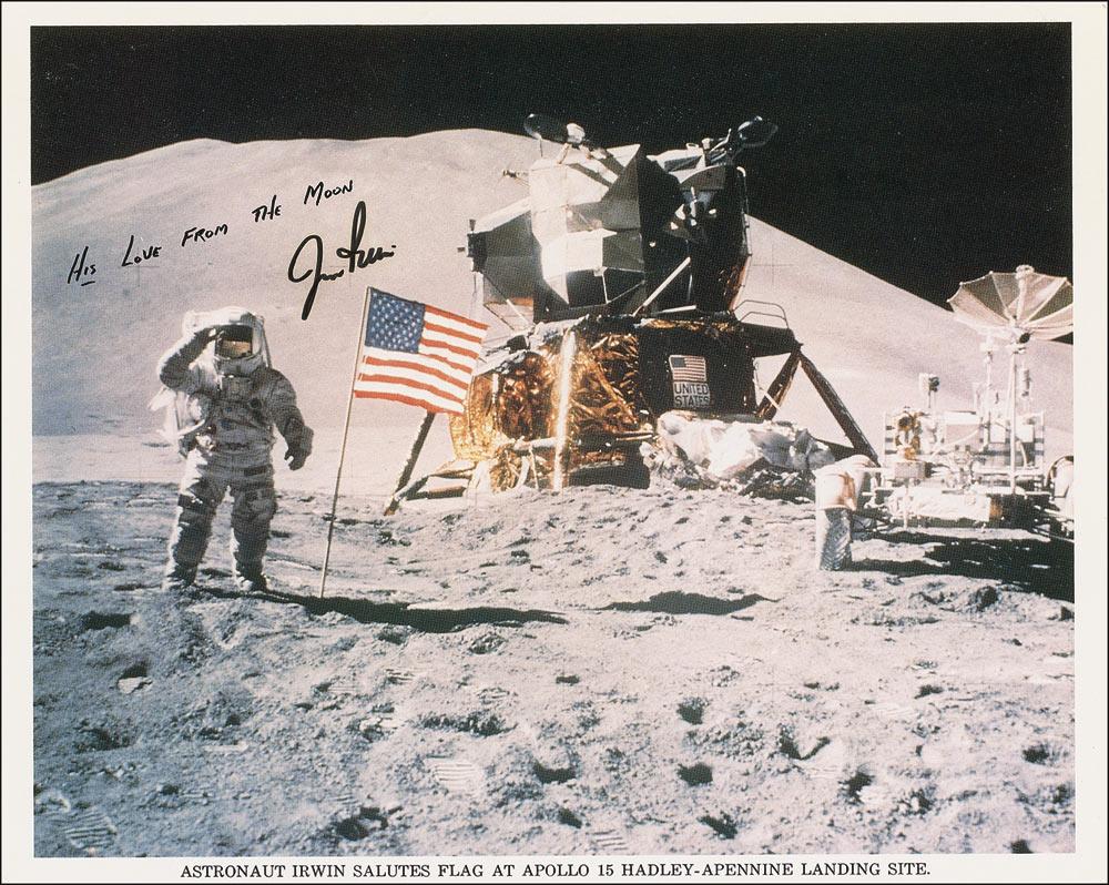 Two signed photos: color satin-finish 10 x 8 photo of Scott saluting the flag on the lunar surface, signed in blue felt tip “7th Man on the Moon, Dave Scott, Apollo 15”; and a color 10 x 8 NASA photo of Irwin also saluting the flag on the moon’s surface, signed in black felt tip beneath a pre-printed sentiment. In very fine condition.