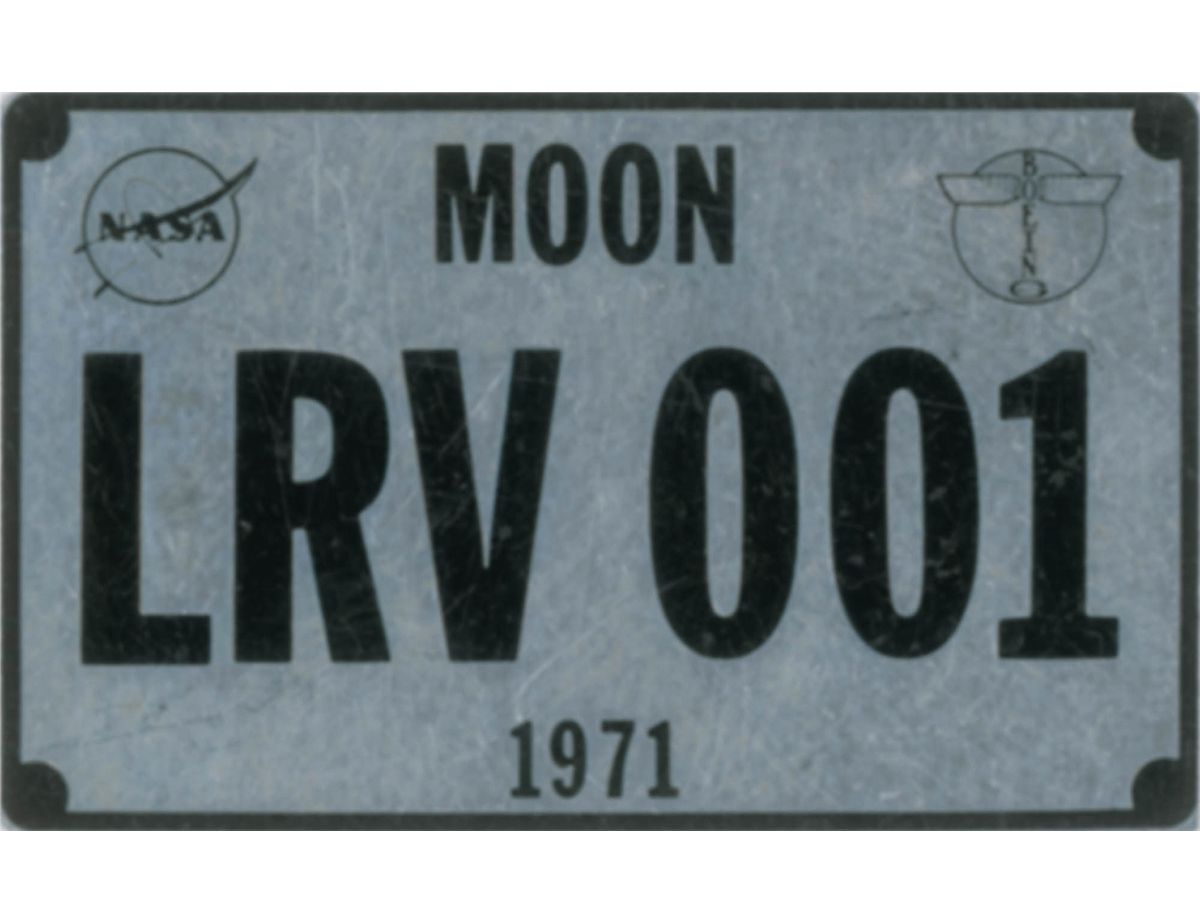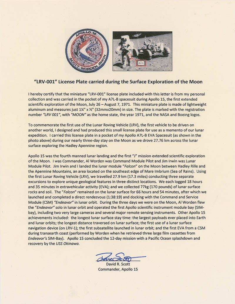 Flown aluminum ‘lunar rover license’ plate, 1.25 x .5, marked with the registration number "LRV 001", with "MOON" as the home state, the year 1971, and the NASA and Boeing logos in the corners. Astronaut Dave Scott carried them in his space suit knee pocket on all three lunar EVAs, including on the lunar rover. Accompanied by a letter of authenticity from Dave Scott, stating, in part: “I hereby certify that the miniature ‘LRV-001’ license plate included with this letter is from my personal collection and was carried in the pocket of my A7L-B spacesuit during Apollo 15…To commemorate the first use of the Lunar Roving Vehicle (LRV), the first vehicle to be driven on another world, I designed and had produced this small license plate for use as a memento of our lunar expedition. I carried this license plate in a pocket of my Apollo A7L-B EVA spacesuit (as shown in the above photo) during our nearly three-day stay on the Moon as we drove 27.76 km across the lunar surface.” In fine condition, with a few trivial surface marks.