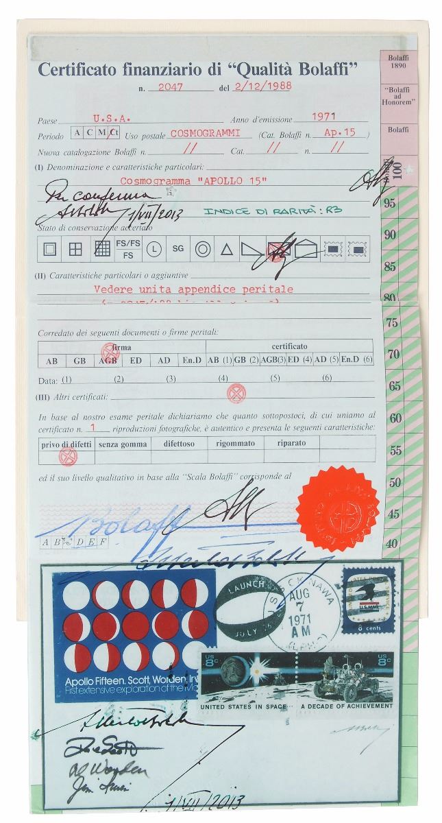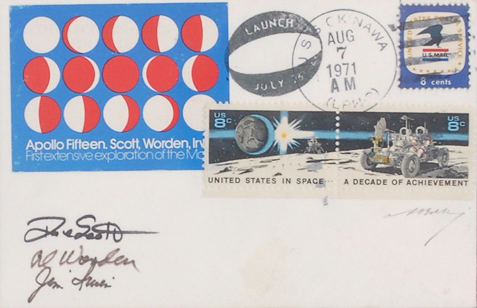 Flown ‘Phases of the Moon’ postal cover, 5.5 x 3.5, carried into lunar orbit during the Apollo 15 mission, with an affixed color cachet depicting all 15 phases of the moon and a cancellation of August 7, 1971, USS Okinawa, signed in the lower left in black felt tip by Dave Scott, Al Worden, and Jim Irwin. Reverse bears a recovery date stamp, and the front a launch day stamp. The cover includes a flight-certified appreciation card from the Apollo 15 crew, reading, in part: “We hope this little souvenir of Apollo 15’s journey to the Moon will be a welcome addition to your Memoirs. We made it especially for those who have been close to us all during the long period of preparation.” In fine condition. Accompanied by a folder and certificate of authenticity from Qualita Bolaffi. Created by German stamp dealer F. Herrick, one hundred and forty-four of these covers were carried in Al Worden’s PPK kit during the Apollo 15 mission, and later affixed with two eight-cent Decade of Achievement stamps and a single US Mail eight-cent stamp purchased aboard the USS Okinawa recovery ship. Deriving from the first of NASA’s extended ‘J’ missions, this exists as a scarce and sought-after flown example with an especially appealing image of the moon’s phases.