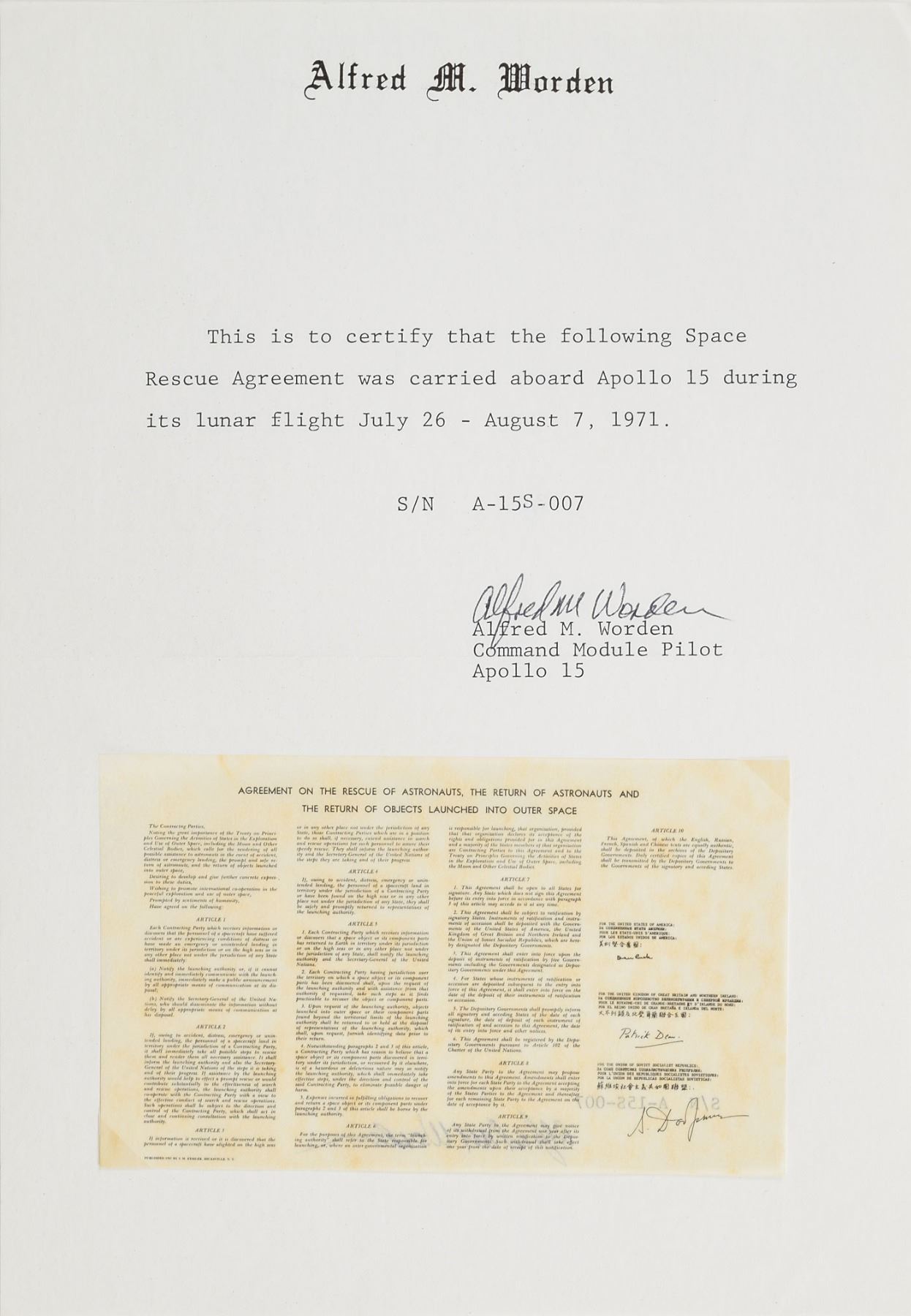 Flown printed Space Treaty entitled “Agreement on the Rescue of Astronauts, the Return of Astronauts and the Return of Objects Launched into Outer Space,” carried aboard CM Endeavour during the Apollo 15 mission. The agreement measures 5.5 x 3.5 and is presented on a signed letter of authenticity from crew member Al Worden, stating: “This is to certify that the following Space Rescue Agreement was carried aboard Apollo 15 during its lunar flight July 26-August 7, 1971.” In fine condition. Also referred to as the ‘Rescue Agreement,’ it is an international agreement setting forth rights and obligations of states concerning the rescue of persons in space. The Agreement, created by a 1967 consensus vote in the United Nations General Assembly, came into force in 1968.
