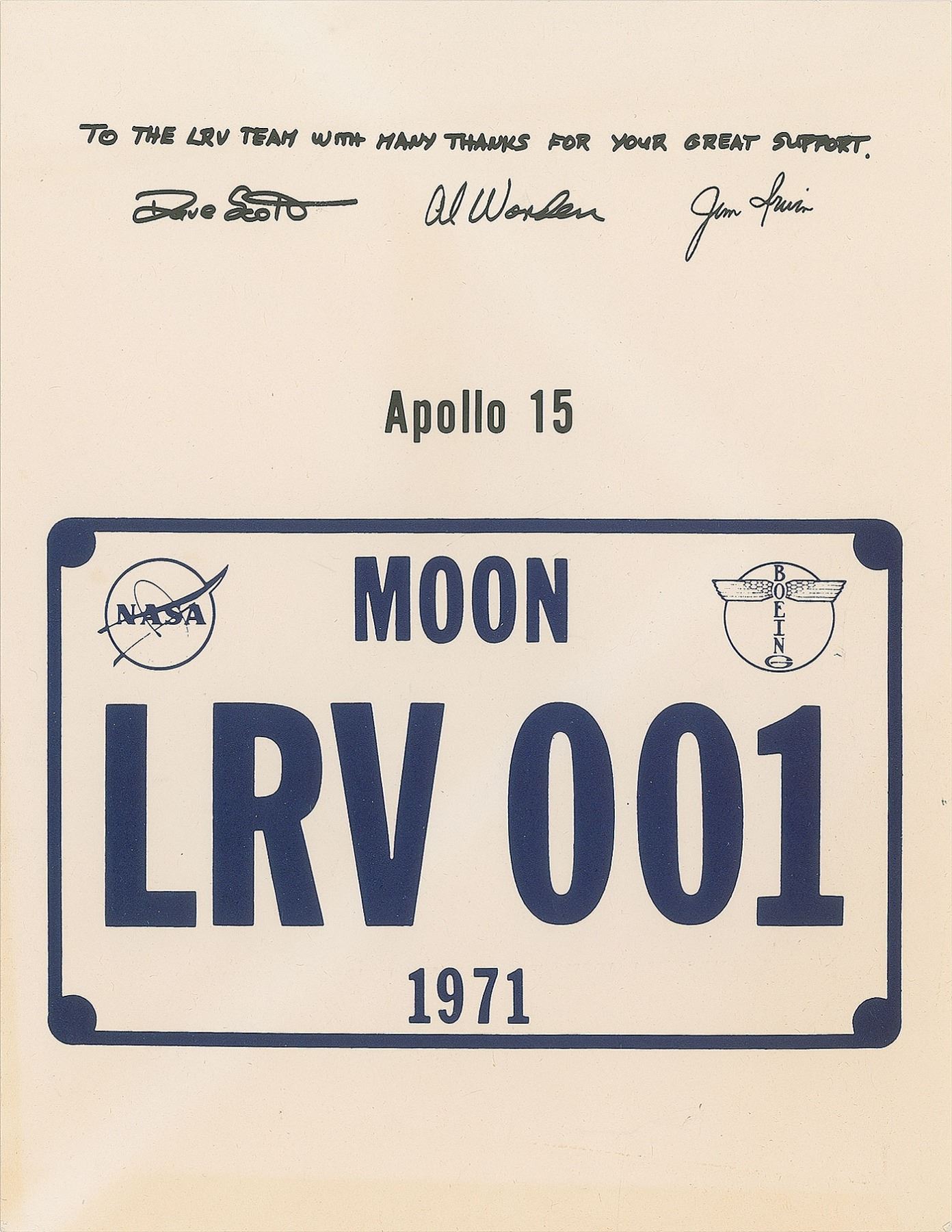 Print of an Apollo 15 Lunar Roving Vehicle license plate, 8.5 x 11, bearing a preprinted inscription, "To the LRV Team with many thanks for your great support," with preprinted facsimile signatures of the crew below. In fine condition.