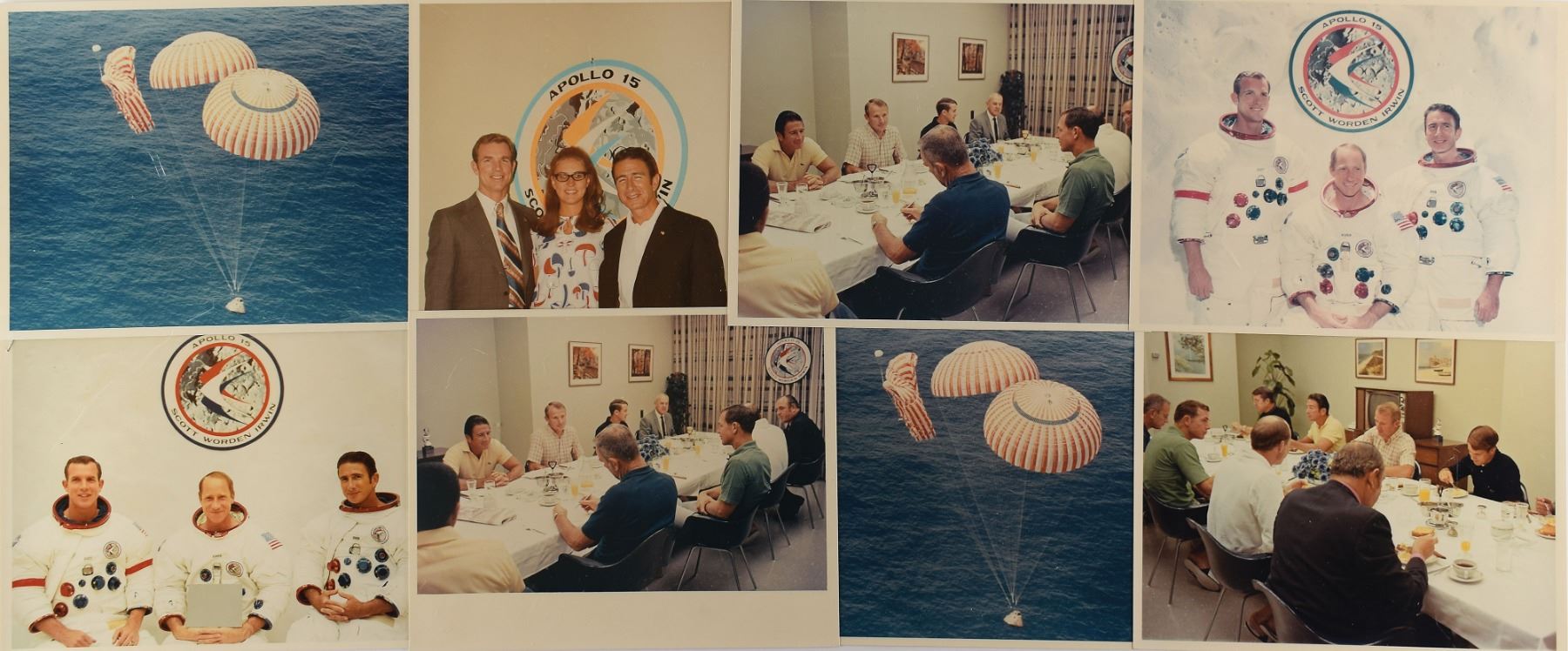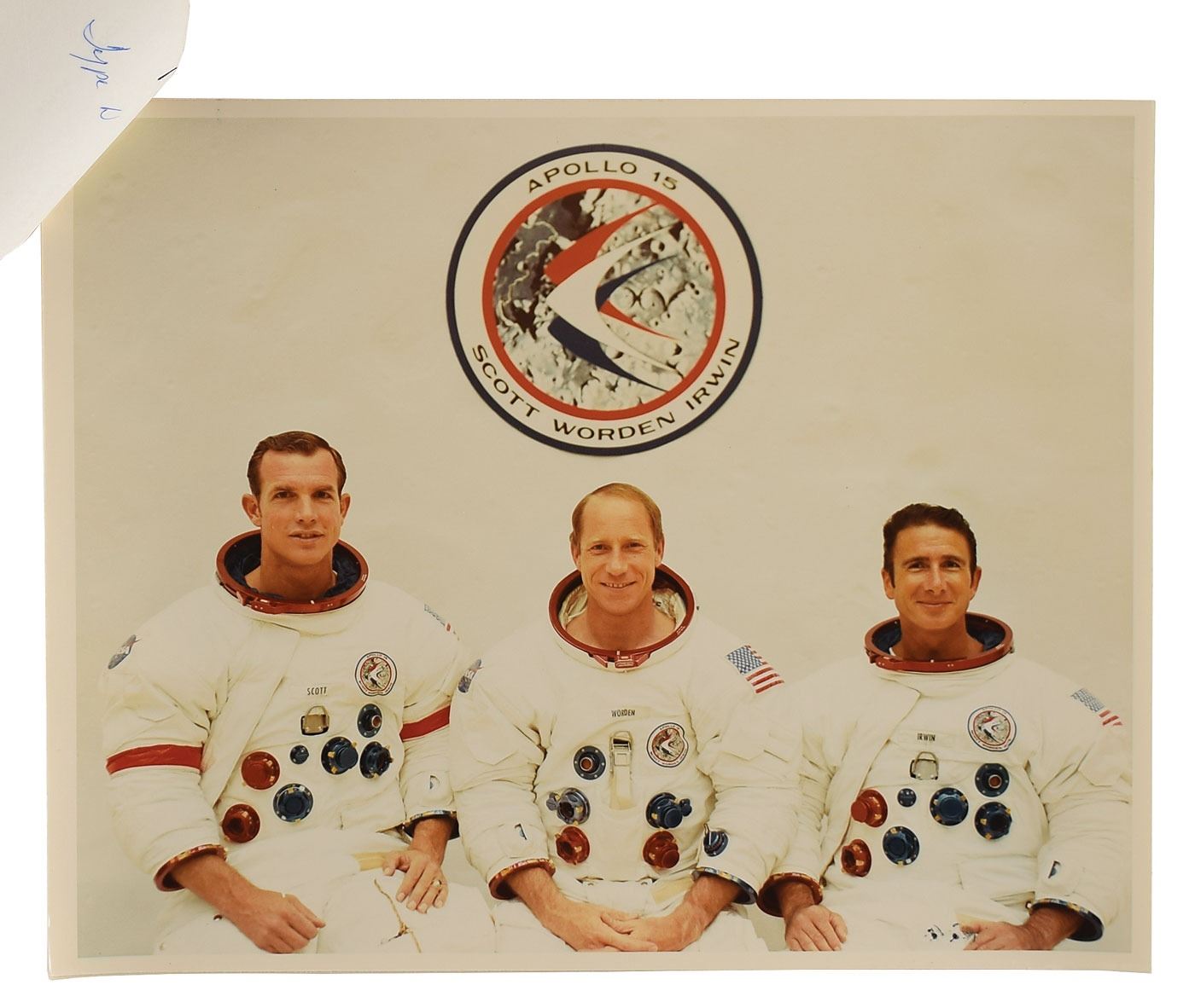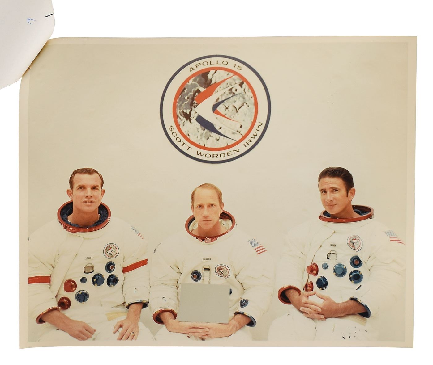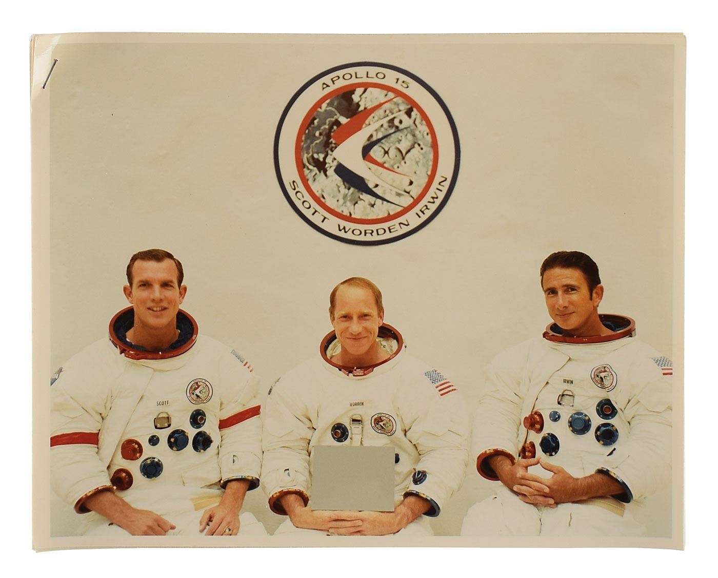 Grouping of 10 vintage original NASA photographs of the Apollo 15 astronauts, including three color glossy 10 x 8 'outtake' photos, stapled together, showing the crew in their white space suits with their mission emblem in the background. Other photos include (with duplicates): the official crew white space suit photo; the prelaunch breakfast of the Apollo 15 crew at the Kennedy Space Center; Dave Scott and Jim Irwin posing with a young woman; and two images of the Apollo 15 splashdown. The majority bear purple NASA caption text and "A Kodak Paper" watermarks on the reverse. In overall fine condition.
