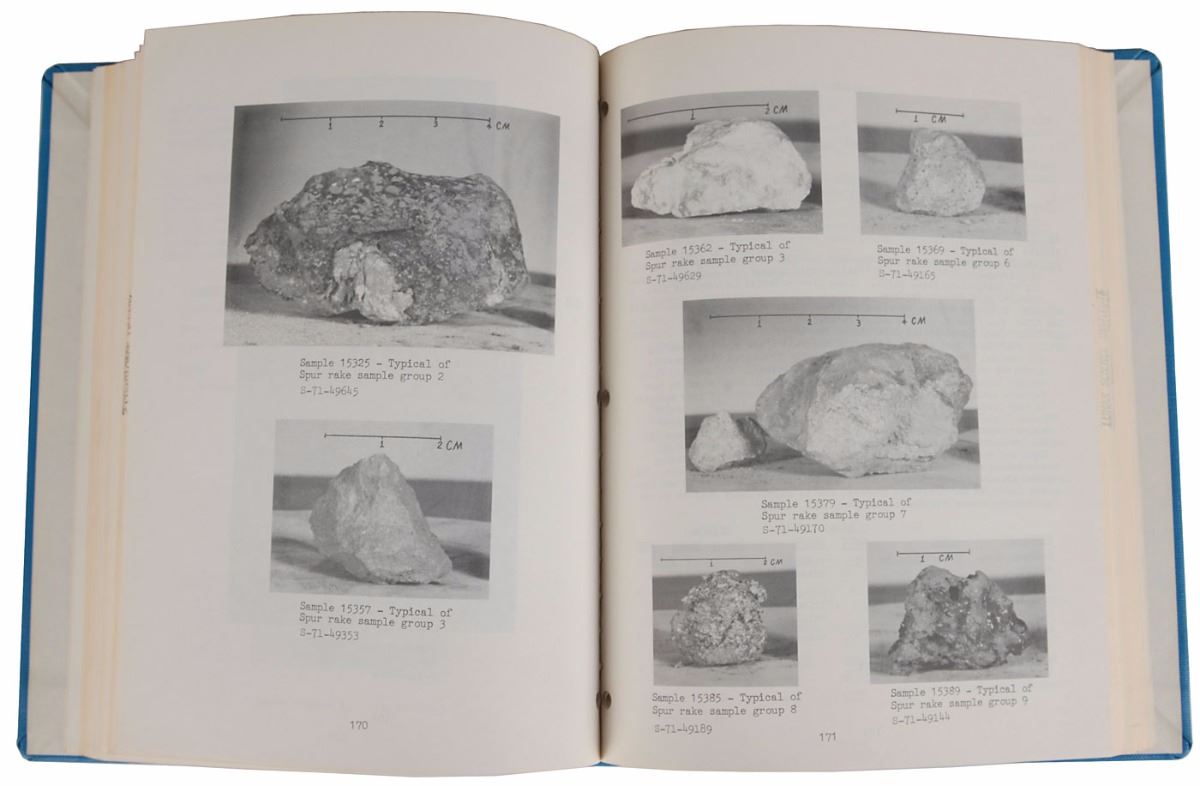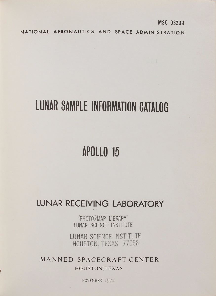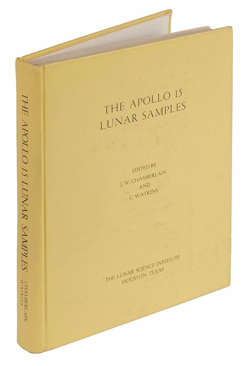 Two rare official NASA hardbound reports: one volume entitled “Lunar Sample Information Catalog, Apollo 15,” produced by the Lunar Receiving Laboratory, 8.25 x 10.5, 323 pages, November 1971; and one volume entitled “The Apollo 15 Lunar Samples,” produced by the Lunar Science Institute, 9 x 11.25, 525 pages, October 1972. In overall fine condition.