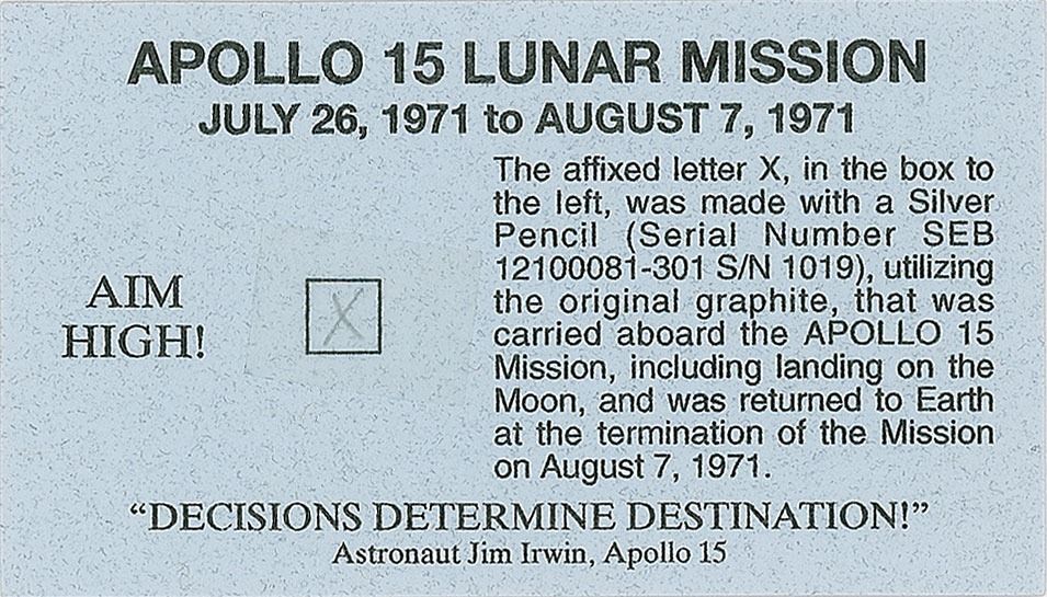 A graphite pencil “X” made with a flown silver pencil carried on board the Apollo 15 mission. Mark is made on a 3.5 x 2 card, which reads, in part: “The affixed letter X…was made with a Silver Pencil (Serial Number SEB 12100081-301 S/N 1019), utilizing the original graphite that was carried on board the Apollo 15 Mission.” In fine condition. Accompanied by a photocopied letter of authenticity from LMP Jim Irwin and the High Flight Foundation stating that the pencil was carried to the moon.