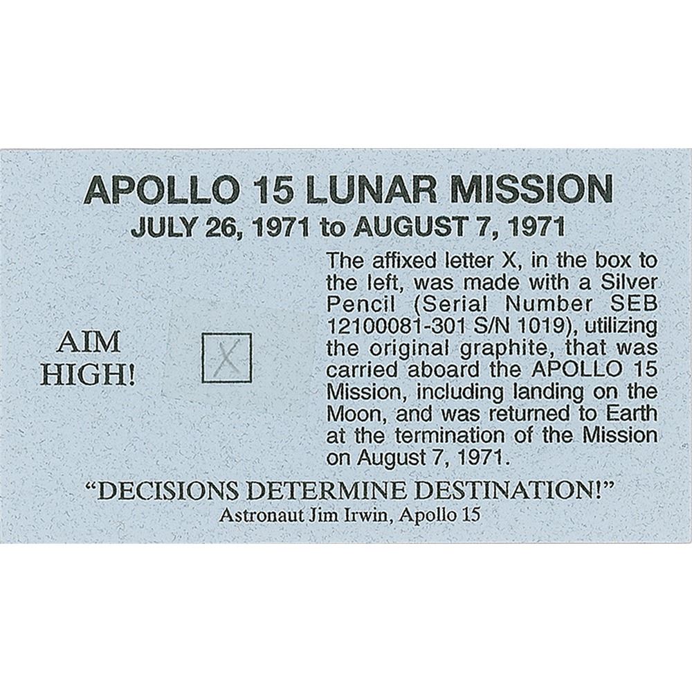 A graphite pencil “X” made with a flown silver pencil carried on board the Apollo 15 mission. Mark is made on a 3.5 x 2 card, which reads, in part: “The affixed letter X…was made with a Silver Pencil (Serial Number SEB 12100081-301 S/N 1019), utilizing the original graphite that was carried on board the Apollo 15 Mission.” In fine condition. Accompanied by a photocopied letter of authenticity from LMP Jim Irwin and the High Flight Foundation stating that the pencil was carried to the moon.